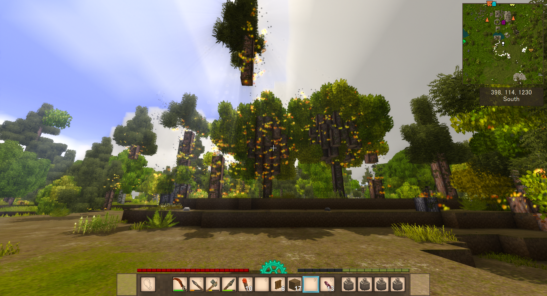 1. I would keep the setting on if it didn't lag my game, and also not leave so many floating leafs behind. Also would be nice if tree seeds could drop from this (not guaranteed but much higher chance than chopping trees do since no wood or sticks are gained), so that you can try replanting some of the forest.