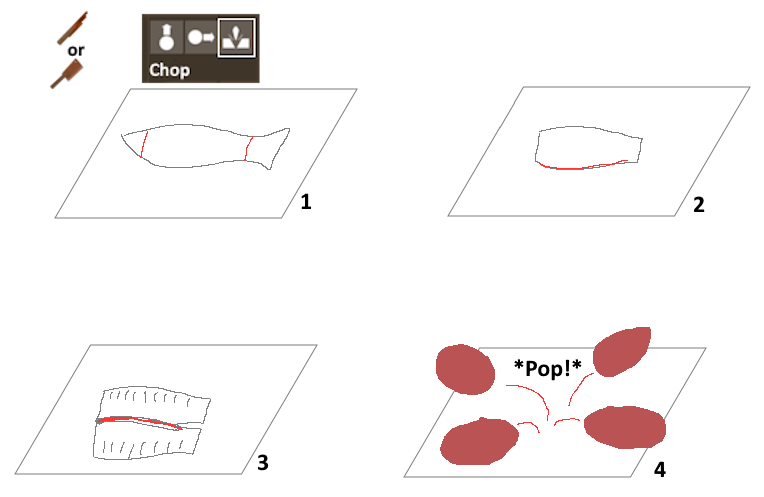 0. Lay a small carcass or cut on a cutting board 1. Chop off the undesireables 2. Slice to expose inside 3. Debone/ cut out innards 4. Catch flying cookables