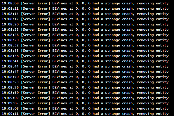 4. 08:30:12 [Server Fatal] System.NullReferenceException: Object reference not set to an instance of an object at WildFarming.BEVines.growthMonitior (System.Single dt) [0x000be] in <10fe5a783c5c4cf99e531913ae0abdae>:0 at Vintagestory.Common.EventManager.TriggerGameTick (System.Int64 ellapsedMilliseconds, Vintagestory.API.Common.IWorldAccessor world) [0x000d3] in <be10c4c7e7ee4ac5b68783f6507c58a7>:0 at Vintagestory.Server.CoreServerEventManager.TriggerGameTick (System.Int64 ellapsedMilliseconds, Vintagestory.API.Common.IWorldAccessor world) [0x00000] in <be10c4c7e7ee4ac5b68783f6507c58a7>:0 Server running 1.15.10, having the same issue Prinzip had. Used worldedit to try and fix some broken water and this started spamming so hard it locked the server up.