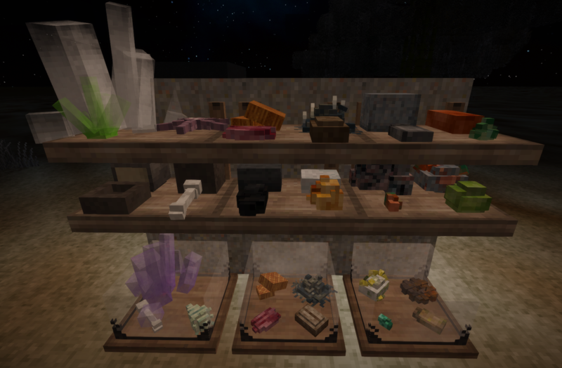 Yes, display cases and shelves will be your best bet for mineral displays. Display cases in particular work very well, and can hold anything a shelf can hold (minus clay items). Most every mineral/ore in-game can fit on a shelf or display, as far as I know.