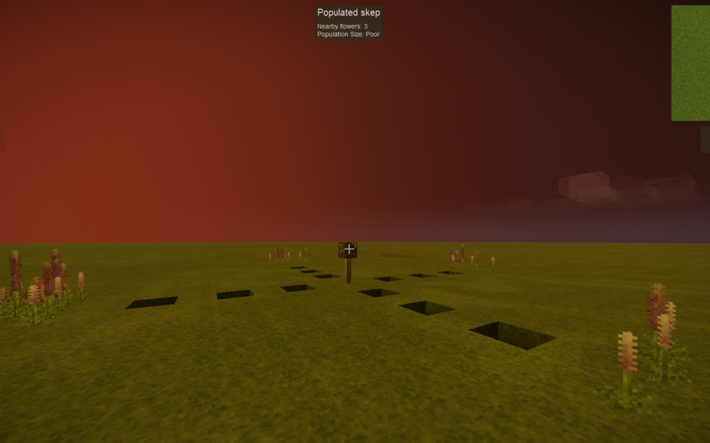 When you place a flower (or most any plant), it places it in a random set position within the block to add minor variance. The range on beehives is actually not based on exact block lengths--I'd guess it's actually more of a circle. The takeaway is that flowers may or may not count towards a beehive (if they are near its max range) depending on where the flower is placed within the block. Here is an example: A skep with a row of 3 flowers placed 8 blocks away in all directions. Notice the "nearby flowers" is not a multiple of 4 (or not zero), as you'd expect--that is because a particular 3 flowers are placed nearer to the skep inside of their block (close enough to fall within its range).