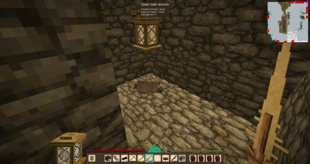 Getting more and more interesting. Got some rabbits and racoons inside again, still winter so i don't mind. But one of the rabbits didn't have a hitbox. I couldn't kill it. First i thought the carcasses of the others hid it, but when i carved them up it still didn't show up. Managed to kill it still by throwing rocks at it. But still no hitbox so i couldn't harvest it. Are these things common? It moved up the wall when it died, but animals usually do things like that when they die.