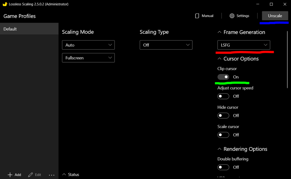 Make sure you have LSFG selected for Frame generation, clip cursor on. If you wish to see your new frame rate, scroll down and select "Draw FPS", other fps capturing software won't detect the generated frames due to the frame generator being driver-based. Upscaling is currently very wacky to do on VS cause the game doesn't let you select specific window sizes.
