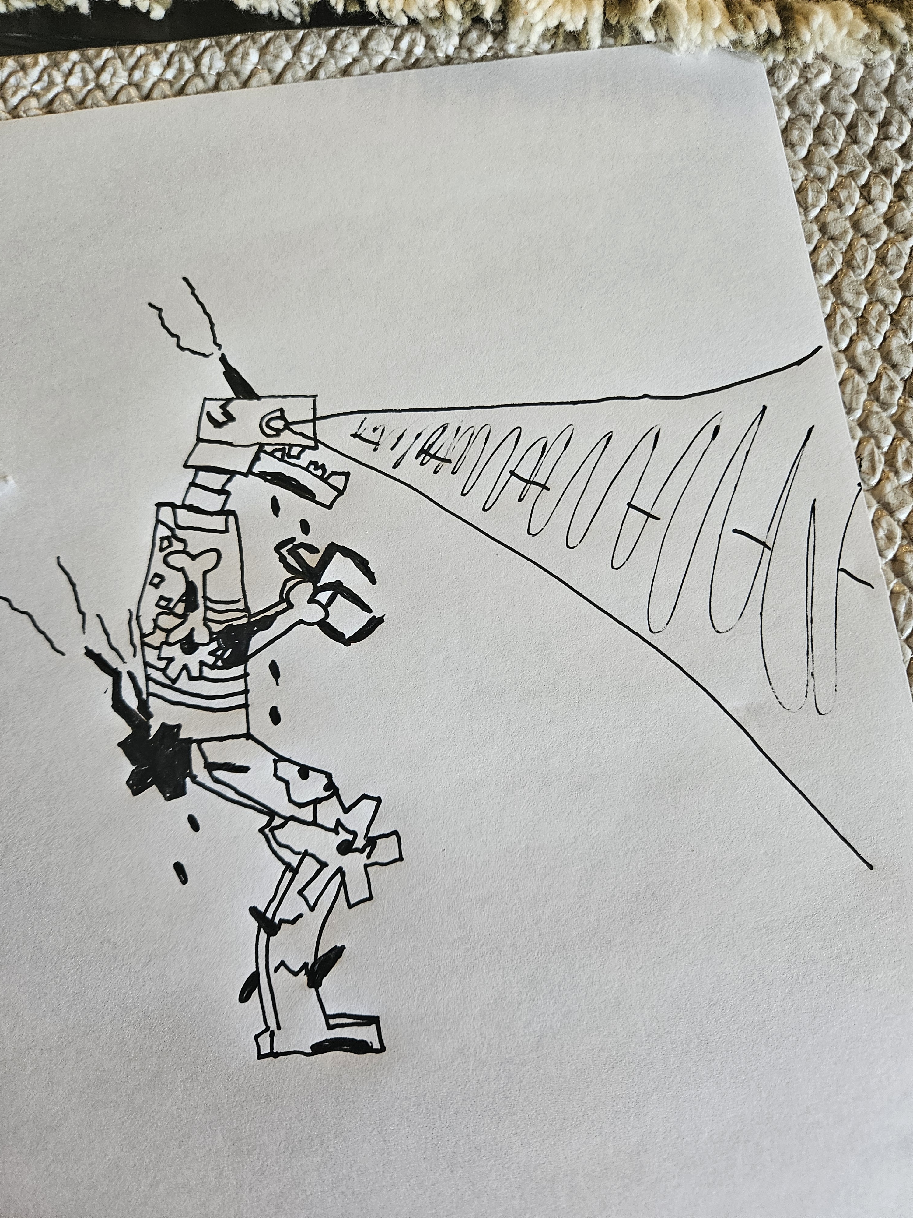 In one of the upcoming story chapters, there could be a steampunk-esque catacomb where these four block high monsters roam, unique and confined to the area. Skeletal remains of past workers, crafted back to "life" using limited technology- instructed to guard whatever's inside. With pipes of steam protruding out of their grotesque mix of bone matter and scrap metal, the sound of their gears jankily trying to turn in order to move their limbs in unnatural fashion is ominously present. Embedded in one of their eyeless sockets is a spotlight of sorts. Being heavily armored by their rusted metal plating, they're immune to all forms of damage. If they spot you in their spotlight, the light turns red and the chase is on! Unfortunately, not for long, because they're slightly faster than the player. The only option of defense you have if you're spotted is to throw something into their flashlight eye to blind them long enough to escape. "They served no purpose of their own in life, dedicating their days to serving others. It's much like that now, just without employee benefits." (Reference art is scuffed, I haven't drawn something in a looooong time lol)