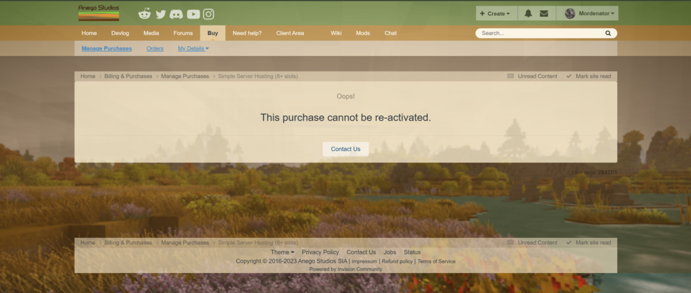 1. My friend and I want to play on a server again since 1.20 is on the way so I went to renew my vintagehosting subscription which has expired a few months ago. For some reason it just sends me to a error page saying I don't have permission to do so, which is kinda weird because I'm trying to pay you? lol. Does anyone have any idea why this is, what I can do about it to fix it or anyone I can contact to fix it? I have already put in a support ticket which has been unanswered for a few days and sent a message to Vallen on discord (idk if he's the right person to contact its just because he fixed my last issue). We are both FIENDING to play I would greatly appreciate any helpful advice for this issue.