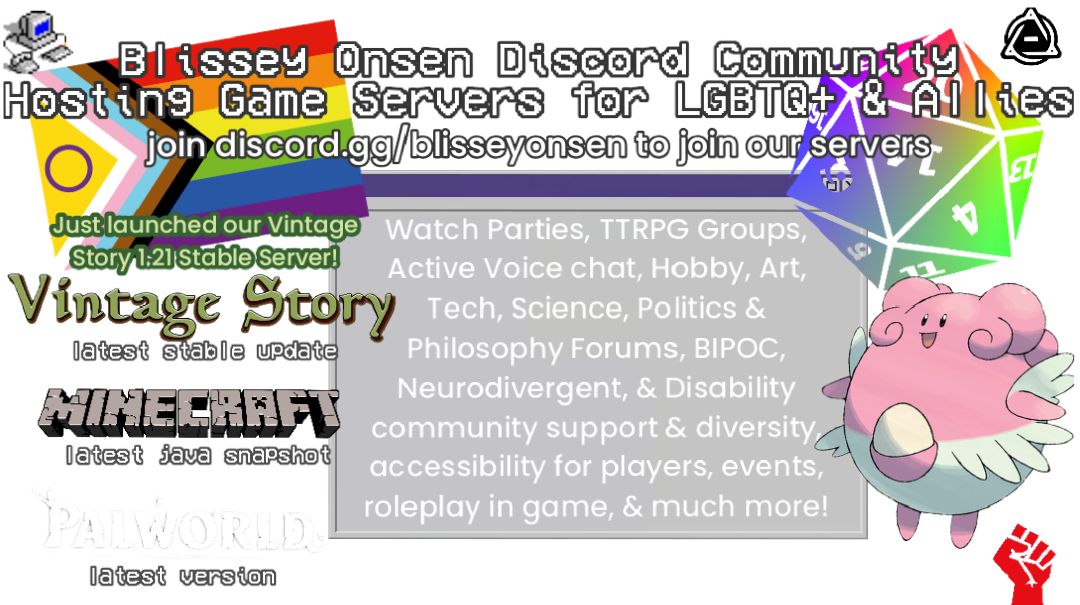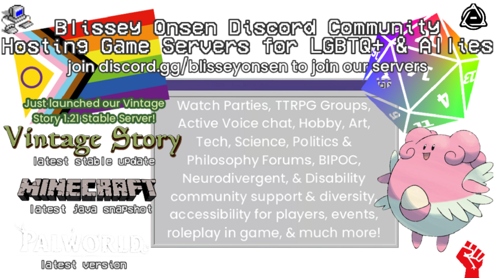 A quick wrap-up of our Community's Servers: The inner goings-on of the Onsen's Virtual Spaces. discord.gg/blisseyonsen Minecraft has been updated to 1.21.9 Modding Soon? Copper Golems & new Redstone Blocks & Logic are now completely tweaked and fixed in this version. You may need to play this version on the Vanilla Minecraft Client as mod launchers catch up. The end has a visual rework, and copper equipment and furniture/blocks are fully cleaned up. You may need to play this version on the Vanilla Minecraft Client as mod launchers catch up. Try adding Client-Side mods in a week. Palworld has been updated & is up and running again. We're making sure our Palworld server is updated in anticipation for the Palworld x Ultrakill collaboration coming out "later this year." Check #server-info in our Discord for our passwords & server status, DM u/cosmobeau on Discord for IPs to our servers. (Must be in the Blissey Onsen Server to join.) Vintage Story is updated to 1.21.1 & has a whole suite of mods now We also have an event planned for the Resonance Archives! RP voice-chat, QP's Chisel Tools, and the rest of the Combat Overhaul Suite has been updated just in time! Yes, we have firearms now! While we wait for Knapster to update, please utilize Pottery Wheel & Helve Hammers. We will be adding the Helve Hammer mods as they get fixed. Links to mods in #server-info under thread, #Hedonia-Chapter-2-Redux! & our VS forum. Our server is now accepting new memebers again! send our invite link, https://discord.gg/blisseyonsen to invite others into our gaming servers! Check our VS forum post if you'd like to comment or share any images of our servers there! Happy gaming! https://www.vintagestory.at/forums/topic/17267-hedonia-redux-1211-modded-vintage-story-minecraft-palworld-hosted-by-lgbtq-allies-blissey-onsen-discord-community We also Host other gaming clubs! Right now, our most popular events: