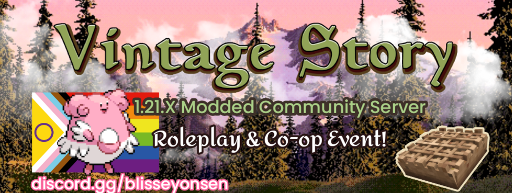 Join us at Blissey Onsen to get here two weeks before we tackle the Resonance Archives Together! We are a LGBTQ+ & Allies Community that is truly accepting, regardless of who you are, POC, Neurodivergent, Disabled, International, New to gaming, etc. We are a roleplay encouraged server. Backstory: The settlement in the Continent Hedonia slowly built a settlement from Seraph stragglers popping back into existence after the Incident of Jonas Falx's Great Machine. Being cast out of time, and thrust back into this harsh world, we fought through with industry and perseverance to create our own village. Together, we sought out a sense of community, and answers to our existence. Our collective goal became clear: we needed to seek out answers and knowledge to understand and better ourselves. It only took a few months of exploring and discussing with human survivors to learn we Seraphs were once human, altered by Jonas Falx's Salvation Engine, a made from the same chaotic technology that is thought to have brought the Rust to this world, in a desperate attempt to wipe the Rot out. People nearby were warped out of time, and time being altered was what removed the rot- not truly cleansing it but changing time. This was done with understanding Temporal Stability, and as we have experienced first hand, being unstable brings you closer to that other Dimension- what we call the "Rust World". There are many remnants of what occurred when the Rot first spread, humanity as a whole here withdrawing underground to escape it's hellish grasp on the flesh, and the days following underground building that Great Machine. We came to realize we were thrust back into this world in this location because these events happened nearby. Ruins to underground bunkers and makeshift cavern towns could be found across the lands we found ourselves in, and humans here have oral tales and old scrolls, books and artifacts from those events. One, a treasure hunter, told us they had a map to one such underground fortress, possibly the largest of its kind: The Resonance Archives. For us, and people caught up in this world torn from the possibility of civilization, he wanted proper, newly smithed tools in exchange for this knowledge. Finding simple, proper equipment for rebuilding is scarce among these lands. Our local smith crafted tools and came to him personally to exchange for this map, and once brought back to our village, we made a plan to travel to and excavate these ruins as a community of Seraphs. Alchemists, tailors, warriors, metalworkers and skilled Seraphs alike came together to equip us for the worst. Tinkerers and scholars studying Temporal Stability and the Rot and Rust entities calculated for the worst of creations in this abyssal library. We sent a scout ahead to make a makeshift path for us and survey the area outside and immediately inside the entrance. When our scout came back, it was reported that the entrance was clear, but the actual ruins lay below a profound depth not visible from the shallow entrance to it's decent. We planned to leave together to excavate at dawn. Our rules are: - No Grieving (Buildings, Domesticated Animals, Etc.) - No stealing - Bad faith, rude gameplay, or malicious/annoying behavior will be handled at moderator discretion even if it's not implicitly stated in the rules. - Do not share our IP to people outside the discord server. This includes your own children, if they are not old enough to join our server they are not 18+ - PvP consent only - No cheats/cheat mods (in game replicatable glitches okay) - Wait for events to do Story Locations (ok to solo after we do them at least once) - Roleplay is encouraged but not necessary - TOS for discord/this server applies for in-game chat, (including respecting people's pronouns.) - When Knapster is added it will be whitelist only, please only request if you need it for accessibility for a disability/low manual dexterity/pain management. ### Mods Added: * [Translocator Engineering](https://mods.vintagestory.at/translocatorengineeringredux#tab-description) * [Food Shelves](https://mods.vintagestory.at/foodshelves#tab-description) * [Purposeful Storage](https://mods.vintagestory.at/purposefulstorage#tab-description) * [Better Ruins](https://mods.vintagestory.at/betterruins#tab-description) * [Millwright](https://mods.vintagestory.at/millwright#tab-description) * [Butchering](https://mods.vintagestory.at/butchering#tab-description) * [Tabletop Games](https://mods.vintagestory.at/tabletopgames#tab-description) * [Carry On](https://mods.vintagestory.at/carryon#tab-files) * [From Golden Combs](https://mods.vintagestory.at/fromgoldencombs#tab-description) * [Primitive Survival](https://mods.vintagestory.at/primitivesurvival) * [SlowTox](https://mods.vintagestory.at/slowtox#tab-description) * [Real Grapes](https://mods.vintagestory.at/realgrapes#tab-description) * [Tankards & Goblets](https://mods.vintagestory.at/tankardsandgoblets#tab-description) * [Shelf Obsessed](https://mods.vintagestory.at/shelfobsessed#tab-description) * [EM](https://mods.vintagestory.at/em#tab-description) * [Shear](https://mods.vintagestory.at/shearlib#tab-description) * [Wool](https://mods.vintagestory.at/wool#tab-description) * [Tailor's Delight](https://mods.vintagestory.at/tailorsdelight#tab-description) * [Mannequin](https://mods.vintagestory.at/show/mod/5532#tab-description) * [Vanity](https://mods.vintagestory.at/vanity#tab-files) * [Longterm Food](https://mods.vintagestory.at/longtermfood#tab-description) (Replaced Vegan Milk, adds soybean milk & more vegan/vegetarian recipes) * [Stone Quarry](https://mods.vintagestory.at/stonequarry) * [Cartwright Caravans](https://mods.vintagestory.at/cartwrightscaravan#tab-description) * [Ancient Armor](https://mods.vintagestory.at/ancientarmory#tab-description) * [Chiseled Block Retention](https://mods.vintagestory.at/cbr#tab-description) * [More Floors](https://mods.vintagestory.at/morefloors#tab-description) * [Medieval Expansion]
