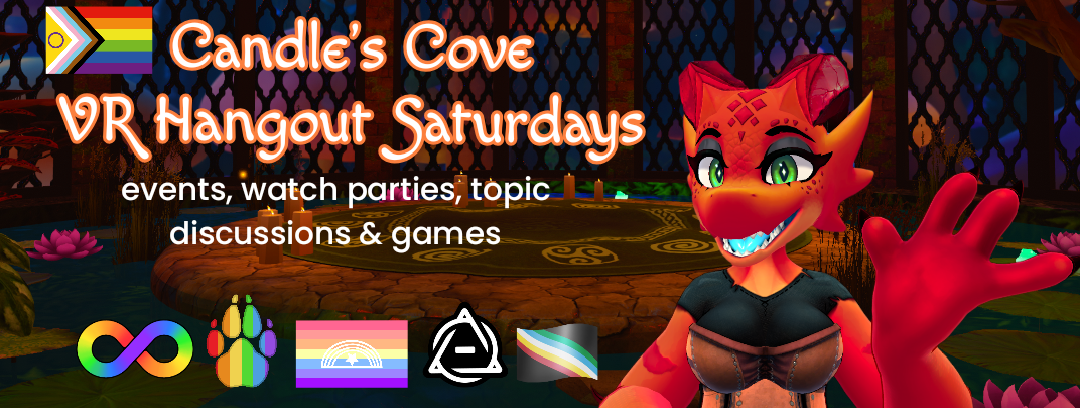 Candle the Kobold is hosting a LGBTQ+ & Allies, Furry, Otherkin, Therian, & Neo/XenoGender friendly VR Hangout on Saturdays at 9pm EST. To join our servers, which includes Minecraft, Palworld, & Vintage Story, verify on our Server Hub Discord, https://discord.gg/blisseyonsen . We verify users for our online spaces this way so it is standard regardless of which server or online space our users will be using, to ensure everyone getting an invite to one of our servers are progressive and not bigoted or intolerant, and to ensure our servers have a centralized space for all server announcements, polls, and forums. Once in the discord, check Events for directions to get into VR Chat, or check Server Info to join one of our game servers!