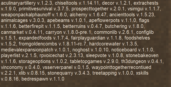 Innovative Vintage Story Server. We strive to provide our players with the best possible gameplay in the best quality. We are an ideal server for beginners as well as advanced players. We are a friendly community that can help you when you are in trouble! We also have some interesting mods that take the game several levels higher than Vanilla! You can own your own territory. There is a map of the game on the server page and the chat is connected to the discord server. Democratic voting on the most important changes on the server and in-game voice chat and much more! Server settings ------------------------------------------------------------------------ 30 days in the game is 1 month Commands: /home (Use once every 4 hours) /spawn (Use once every 4 hours) /home set [Name home] (You must have a temporal gear. Possibility to put up 1 home) /starterkit /msg [Name] [Message] Gravity for earth / rocks / gravel Creating infinite sources of water excluded Regular updates to the latest version Reboot the server every day at 5:00 UTC time Max 64 players Whitelist OFF Food spoils 50% slower Version 1.20.7 PvP ON ------------------------------------------------------------------------ IP: 95.216.20.185:42425 Discord: https://discord.com/invite/RswMpasU9h Website: SOON Server Map: https://vintage-map.beargames.eu ------------------------------------------------------------------------ MODS