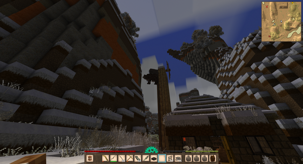 It was winter, my house was almost complete but I was still using a starter shack nearby to do some metalworking, as my proper smithy wasn't done yet. It was the dead of night and I kept hearing what sounded like the squeal of a pig over and over. I went around the shack to look, but found nothing. I climbed the ladder to a small windmill I set up to power a quern to look above and it was the biggest fright I've had with this game. 2 brown bears had climbed up and gotten stuck. I took this picture in the morning but it looked truly horrible in the dark from below, it was like a mutant double bear. I never heard the sounds they made before in this particular circumstance, and I've fought dozens of them.