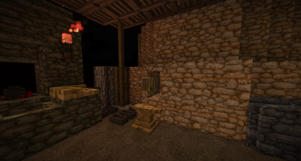 Realizing that you can place blocks between the gap of a helve hammer & anvil, I thought I had an incredibly clever idea. However, to my dismay, the top chiseled block prevents the hammer from functioning. For world context, this is the base of my windmill, placed keenly on the side of my smithing setup.