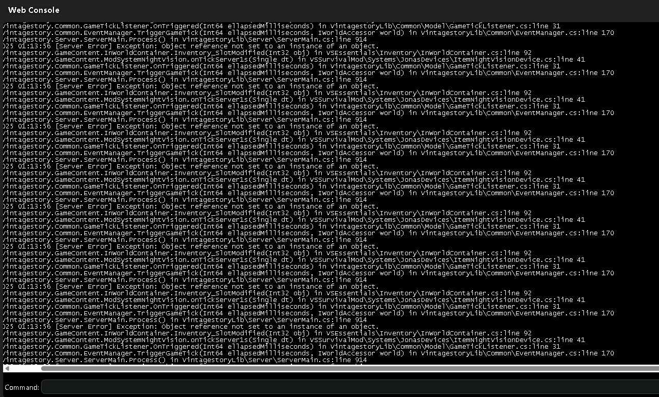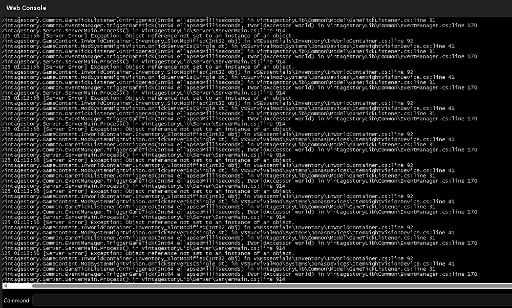 When I use the night vision helmet on my character, I get spammed in the console, and after 2 minutes, it crashes the whole server.