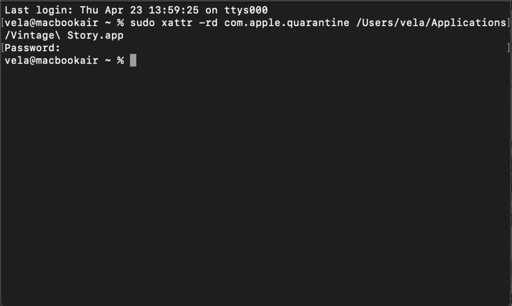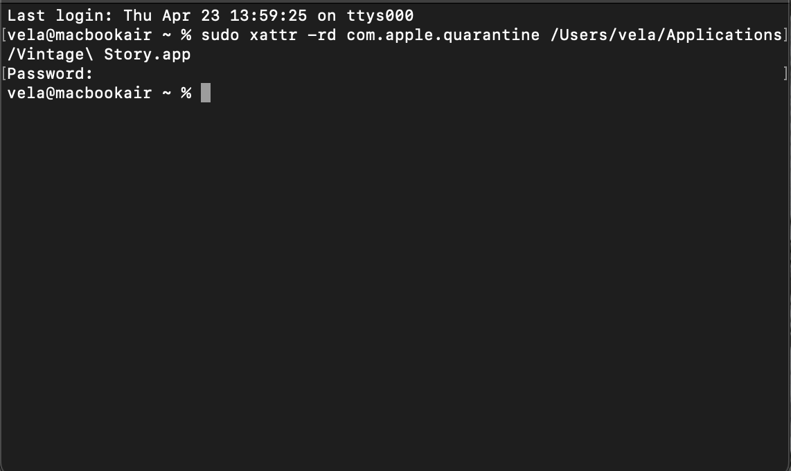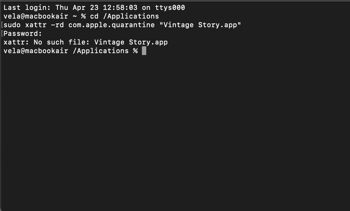 everytime I download vintigestory 1.22.0 and try to start it, it tells me the following: "Vintage Story is damaged and can't be opened. Remove it to the trach can". apparently this issue is common among mac users. So I tried using Terminal. I have tried the following commands: cd/Applications sudo sattr -rd com.apple.quarantine "Vintige Story.app" and: sudo xattr -rd com.apple.quarantine "Vintage Story.app"
