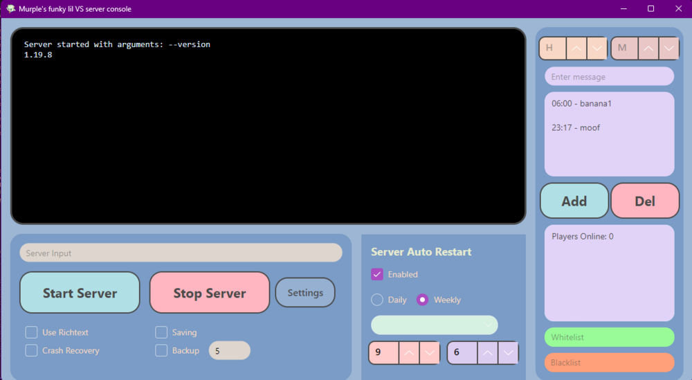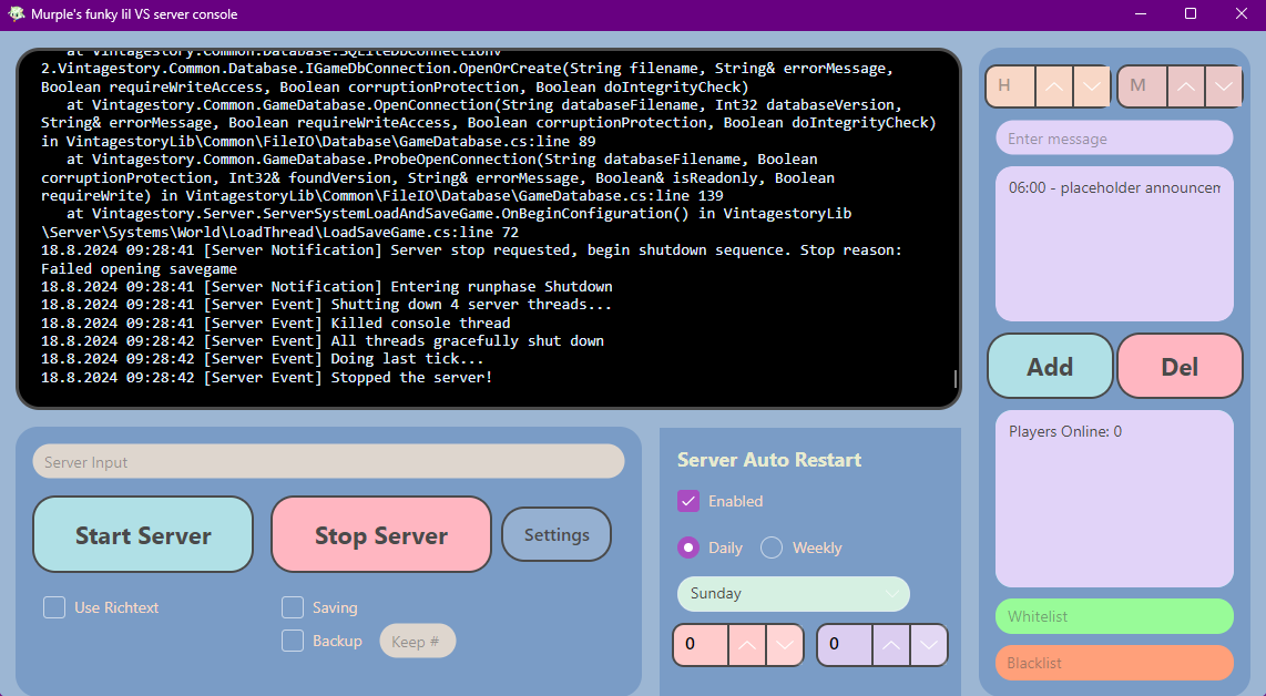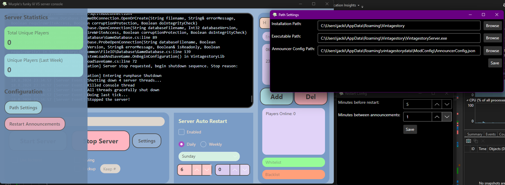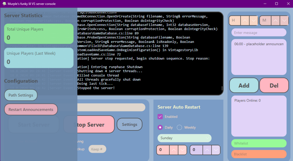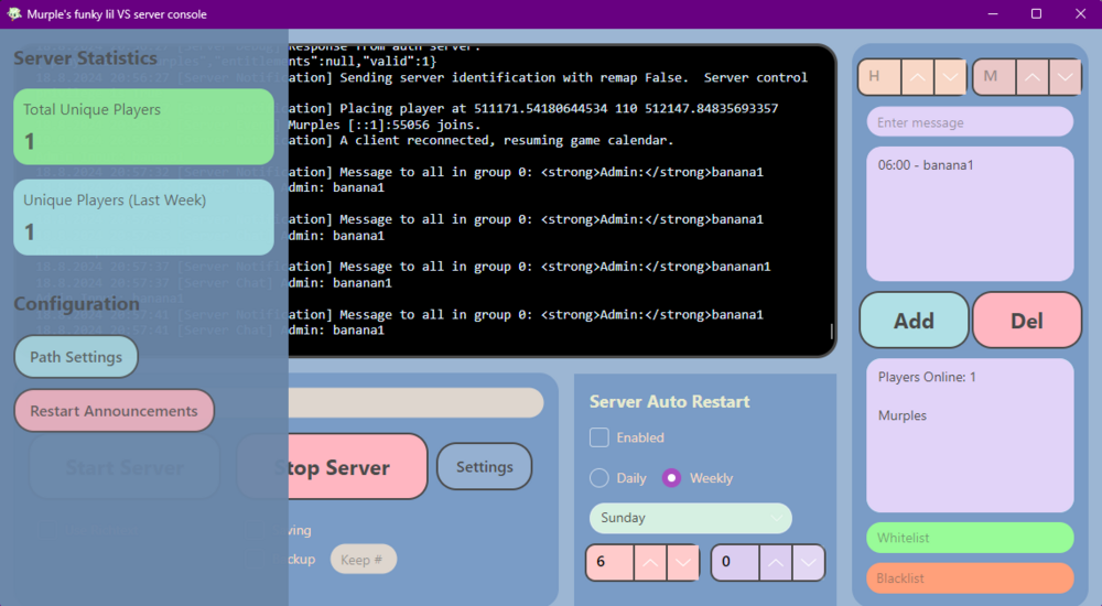 still need to work out the logic for the weekly and total unique player counters, and then need to work out the stuff for the default restart announcements(this one shouldddd be p easy), and then i have a bug to work out with it not keeping the announcerconfig file path leading to it asking for it every time, and finally i need to work on the logic for the automatic backup