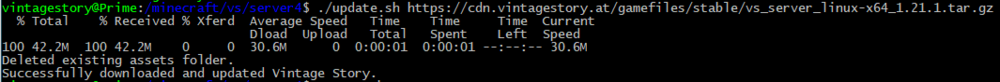 Generally you can copy all files, just backup your server.sh if you're running Linux! I have a script that can help you update your server if you are running linux. Otherwise it's just a simple copy and paste for Windows. Script: #!/bin/bash # Check if a URL was provided if [ -z "$1" ]; then echo "Usage: $0 <URL>" exit 1 fi URL="$1" OUTPUT_FILE="vs.tar.gz" ASSETS_DIR="assets" # First backup server.sh file mv server.sh server.sh.old # Download the contents of the URL into vs.tar.gz curl -o "$OUTPUT_FILE" "$URL" # Check if the download was successful if [ $? -ne 0 ]; then echo "Error: Failed to download $URL" exit 1 fi # Remove the local assets folder if it exists if [ -d "$ASSETS_DIR" ]; then rm -rf "$ASSETS_DIR" echo "Deleted existing $ASSETS_DIR folder." fi # Unpack vs.tar.gz into the current directory # Overwriting all contents if necessary tar -xzf "$OUTPUT_FILE" --overwrite # Check if the extraction was successful if [ $? -ne 0 ]; then echo "Error: Failed to extract $OUTPUT_FILE" exit 1 fi # Restore server.sh file rm server.sh mv server.sh.old server.sh # Notify completion echo "Successfully downloaded and updated Vintage Story." Here's how it looks when you don't run it correctly and when you do: Good luck and happy Vintarianeering!