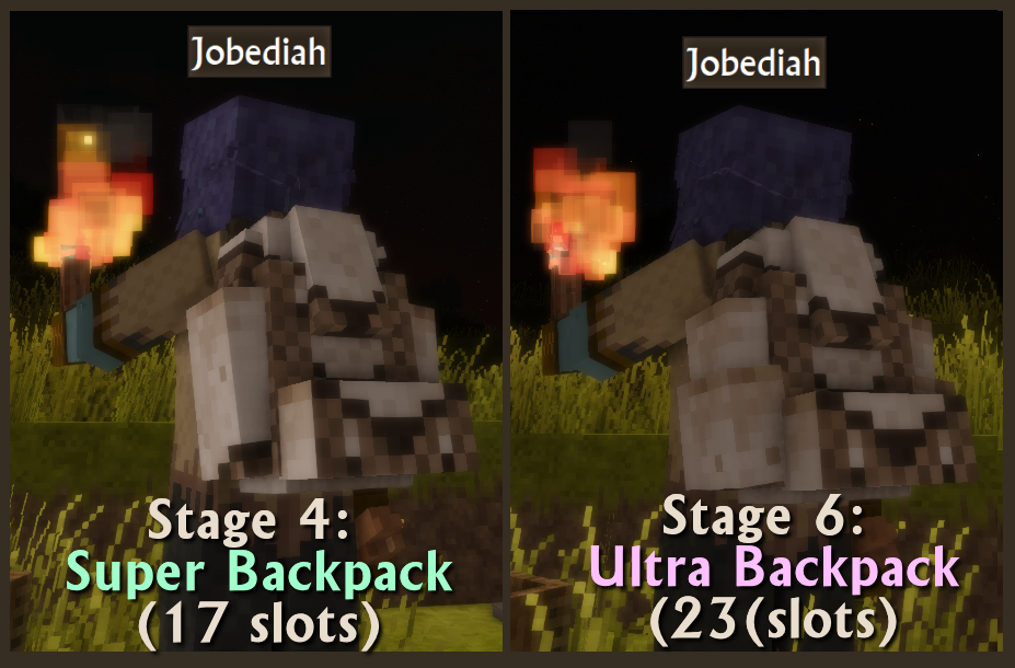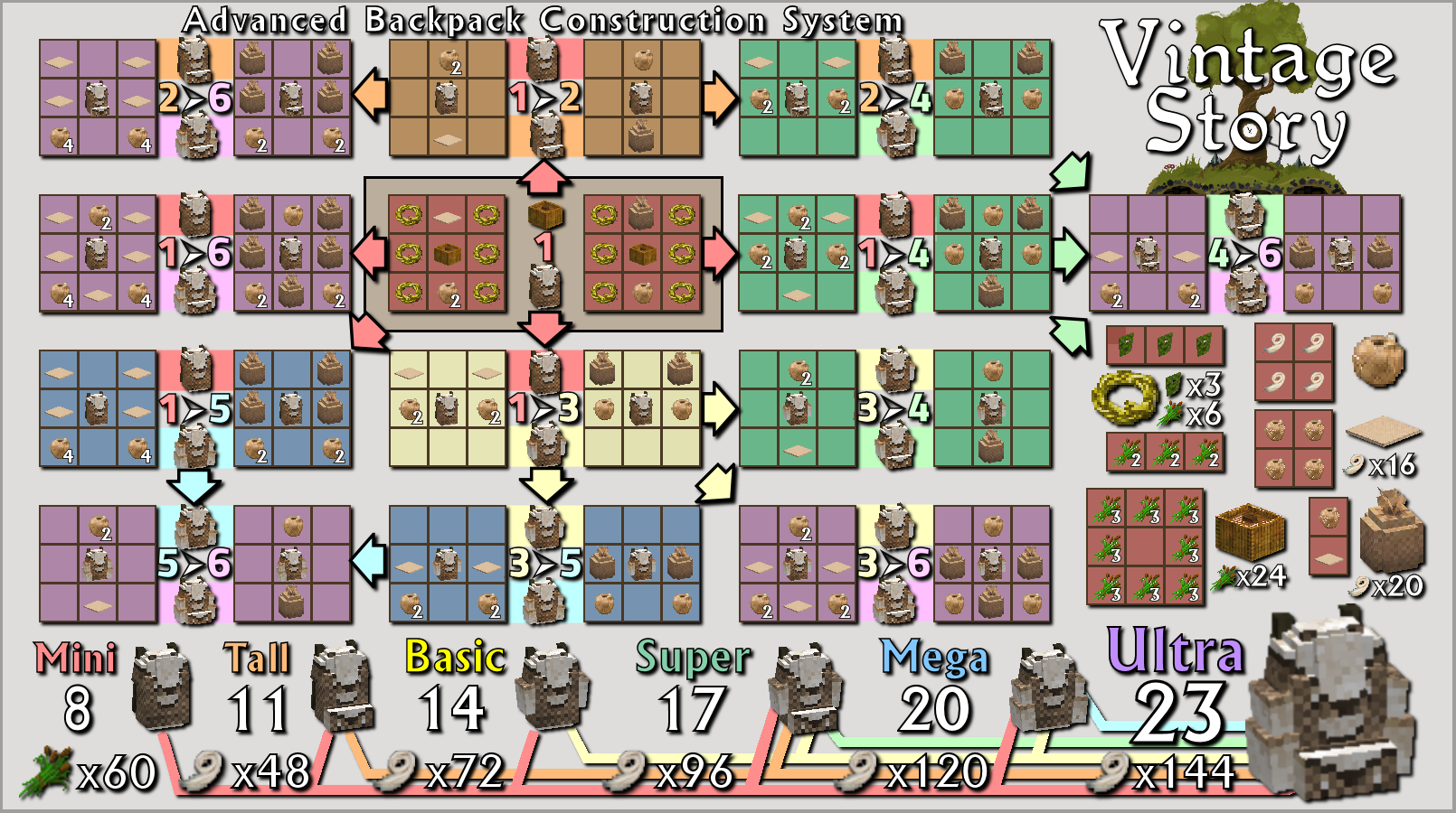 I had no idea how far I could take this, but leave it to this incredible game engine to make it possible, as well as easy to implement. You could say I've been working on this since December 18, according to the oldest recipe image I found. That only 10 days after I started playing. So this is something I quickly felt was going to be needed, but it needed to be done right. I couldn't push the gameplay too far from what the majority expects. So imagine my surprise when someone recently suggested exactly the kind of game mode that I'm almost done developing. Now I know I haven't gone *too* far, and I made it a challenge to get there anyway. This mod is for those like me, and apparently there are quite a few, who wish that we could explore the surface world for a few hours to find just the perfect spot to set up base. Or, just keep on roaming the almost endless landscape, gathering resources to build yourself a spacious inventory, and then using that space to store up every bit of supplies you come across. Perhaps by way of looting out every ancient ruin you can find for miles on end. When you finally land in that perfectly awesome spot, where you instantly know that home sweet home belongs, you'll have all you need to set up base. Or, perhaps with this newfound taste of freedom, your spirit will never settle down, and you won't stop moving until you've climbed every mountain, and fallen off every edge of the world. There's a simple reason for such a drastic change to early game, and the new possibility to follow an entirely different style for the whole game. I don't think MineCraft has worlds this big, or with this much variation to it all. There are genuine reasons to be a life-long explorer, or to not settle down for weeks. And now, that will be possible, but only after a good, satisfying amount of harvesting and crafting along the way to acquire this freedom. Anyway, let's get to the good part, the "Map" I had to create just to help sell everybody on this idea. I wanted this to be so self-explanatory that anyone somewhat experienced with the game could grasp the concept within 2 or 3 minutes. I'm also just as curious to find out what a total noob would think of this, whether it would lure them in or push them away. Start with Red, follow the arrows, and taste the rainbow. Some steps can't be made, as you can see from the lines at the bottom. If you look at the "2->6" step, left of Step 1, you'll see the whole layout. The Mini Backpack has 5 positions to add Linen Sacks as Pockets, using corresponding locations on the Crafting Grid. Every Pocket requires either a Linen Sack and Twine, or Linen and 2 Twine, which is identical. This is the reason for each step having two recipes, if that isn't obvious enough from the color coding. The only way that this could possibly work is if it followed the game's requirement of manual labor to achieve something. On top of that it had to fit in with as many existing items, as well as just making logical sense. And thanks to the brilliance of this game's design and modding system, I was able to pull it off better than I first imagined. It's amazing how the work involved to acquire something literally changes it's value. And it's surprising how a game is actually no fun at all when it just hands you everything. In this case, you're going to need 60 Reeds and 144 Flax Fibers to get a full sized backpack, and do that 3 more times for maximum inventory. Enough rambling already, less yacky more packy. ABCS 1.0.0 Download Link: ABCS_v1.0.0.zip As you can see from the map, it took quite a long time to develop this properly. I had to fully understand how far to push the idea, and how to work it into the current system of items. Initially I had 3 stages, and I had no plans for this to expand to 6 stages, because that would have been ridiculous if I stuck with the standard of 5 slots per Linen Sack. At first I only shrunk the size of Linen Sacks to 4 slots, making the stages 8, 12, 16, 20, 24, and 28. The more I played with it, the more that this seemed genuinely excessive. At first I was still reluctant to shrink it to 3 slots, and whether to go with 4 for a Sack and 3 for a Pocket, but in the end, reducing it to 3 wound up making perfect sense. I had to take into consideration the new concept of the Mini Backpack having 8 slots. Having only 3 items in a Linen Sack is tolerable, because it won't take too long to move up to the Mini, especially since you can use the Sack to create it. Anyway, I stuck with the idea that I should re-use whatever was available already, after trying to come up with a whole new item to flesh out the concept. So I knew it would involve the Stationary Basket somehow. At first I played with the idea of using a higher-tier Saw to cut Wood Boards into "Thin Wood Slats", which could be used to make compartment separators for an organized storage device. But eventually realized that something like this couldn't be put behind the progression wall of requiring an Anvil. Likewise, I was originally going to require Wood Boards to reinforce the bottom of the Backpack, but once I decided on Nomad Mode, that wasn't an option either. Finally I decided on taking a Stationary Basket and wrapping it up in a Linen Sack or Linen + Twine which is the same thing, and using another unit of Twine to assemble it with the straps. And the straps are made from 6 units of Rope arranged in 2 vertical strips of 3, resembling a backpack as best as possible. I love how I was able to make the process revolve around a repeating pattern. First you combine the Reeds into a Stationary Basket, then put the Basket in the center, and surround it with more parts for the Mini Backpack, and then surround the Mini Backpack with Linen Sacks to upgrade it further and further. Throughout the process, you can keep making Linen Sacks to fill up your extra Basket Slots, and use them as inventory immediately, and then later use them for the next Backpack you upgrade. And since you'll 