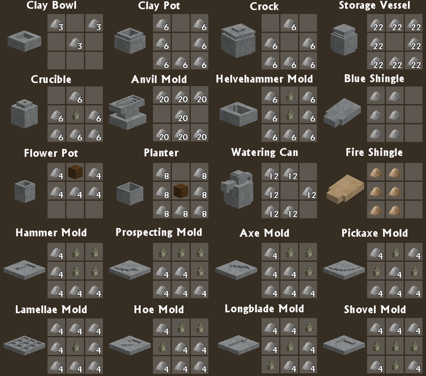 Special thanks to Mr1k3 for starting this idea, and the credit goes to him for coming up with a solution for accomplishing it which I might not have ever considered. It led me to mimic his idea when I polished up his NoMolding mod. I've decided to change the name to make it more positive, as there's no reason to actually remove the Clay Molding system. Perhaps an Easy Clay Modeling Mode, where you can't make mistakes. Just make the player go through the motions of doing the work instead of shift + clicking a giant stack of difficult items. Because that was my reaction to using the original mod: I put a whole stack of clay in a circle and did a Shift-click, and suddenly I had like 13 Storage Vessels. That was completely backwards-unfair. I felt genuinely robbed of the sense of achievement that all the hard work this repetitive chore would have given me. Because that's how you have fun in games these days: working the grind. So I took to updating and reconfiguring the mod that Mr1k3 began. I realized I could use Soil for the pottery recipes the same way he used Flint as a spacer for the Tool Molds. This makes the recipes a different overall signature, and the system knows which item you're trying to make. For instance, the Clay Pot and Clay Planter are both a capital "U" shape, but the planter has Soil in the center. And since the Helvehammer is tall rather than flat, I made it a capital "U" with Flints inside. I used NotePad++ to look into the game's Asset files for the Clay Modeling recipes, and used NP++'s Find/Replace "Count" function to search for the "#" character. That way I could have accurate numbers of how many voxels each mold requires, and maintain some accuracy with how the recipes relate to each other. But I didn't go for an exact 1:1 of how much the recipes are supposed to take. And the amounts are based more on how much time it would have taken to create them, which varies depending on the mold. The basic idea is that you either take the time and effort to dig up larger amounts of Clay, or you take the time to make them voxel by voxel and save on resources. And maybe you make that choice based on simply not finding enough Clay deposits within reach. Or you choose to do manual Molding because you genuinely enjoy doing it, and the savings on resources is just a bonus. So it's not just the number of voxels, it's how complicated the overall recipe is. The Clay Planter and Flower Pots, for instance, have no lids, and are basically just two layers, because you can repeat layer 2 all the way till it's finished. Besides that, they're just cosmetic items anyway, so there's not as much sense of necessity as Storage Vessels or Crocks, which should cost more for multiple reasons. I decided to condense all the recipes into one concise image. It might look like I just deleted a lot of image cropping work, but Paint Shop Pro has some amazing scripting abilities. None of that took as much effort as it looks, but it would have been worth it anyway. Not bad for an app that's 17 years old. Of course I'm willing to take suggestions and make adjustments, after all, this mod itself is a drastic adjustment to an existing mod. I have included the numbers in the JSON as Comments, so you can see the logic that I used. I decided for the sake of discussion I'd include the comments here. Hopefully it makes sense, but it's better than my first attempt. At first I was confusing myself, so I reversed how I divided the Ratio, which previously resulted in lower = more expensive. The numbers in parenthesis are as follows, 1. Total # Voxels, 2. Crafting Slots x Clay Quantity = Total Crafting Units, 3. Modeling Voxels / Total Crafting Units = Cost Ratio "__comment": "[Item Name]: (# Voxels, # x # = Units, Ratio)" "__comment": "Bowls (41 voxels, 3 x 3 = 9, 0.21)", "__comment": "Storage Vessels (924 voxels, 8 x 22 = 176, 0.19)", "__comment": "Clay Pot (161 voxels, 7 x 6 = 42, 0.26)", "__comment": "Ingot Molds (93 voxels, 5 x 6 = 30, 0.32)", "__comment": "Crock (99 voxels, 6 x 6 = 48, 0.37)", "__comment": "Crucible (97 voxels, 6 x 6 = 48, 0.36)", "__comment": "Flower Pot (156 voxels, 5 x 4 = 20, 0.12)", "__comment": "Clay Planter (500 voxels, 7 x 8 = 56, 0.11)", "__comment": "2 Shingles (12x3=36 voxels, 6 x 1 = 6, 0.16)", "__comment": "2 Fire Shingles (12x3=36 voxels, 6 x 1 = 6, 0.16)", "__comment": "Anvil Mold (750 voxels, 7 x 20 = 140, 0.19)", "__comment": "Helvehammer (190 voxels, 7 x 6 = 42, 0.22)", "__comment": "Watering Can (300 voxels, 6 x 12 = 72, 0.24)", As for the Tool Molds, those are something you build so rarely, I'm not concerned if they're a little too expensive. Same with the Anvil Mold, which you're even more likely to only ever need one. And again, overall, the point is that it should feel like a genuine choice as to whether to do the manual work, regardless of whether you have vast amounts of clay at your disposal. Sometimes the logic and realism regarding physical resources has to be warped to accomodate fair and fun gameplay. Like I said, suggestions for adjustments are welcome. Instructions on how to install the font shown in the screenshots into the game: I'm calling it 1.0.1 simply because it's a rework of Mr1k3's NoMolding mod, which you should remove or disable before using this. ClayCrafting1.0.1.zip