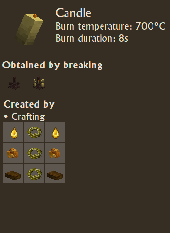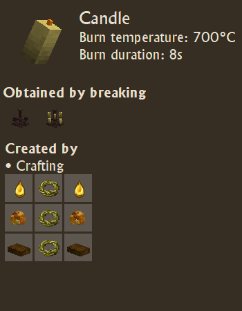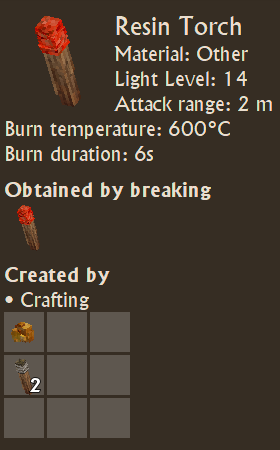 Nope, I forgot to mention that. Since Resin is a valuable resource it makes sense for it to be able to give all these benefits. So Resin Torches are both waterproof ("rainpermeable: false") and no longer become burned out (removed "transientProps" attribute). I could set it to a much longer length of inGameHours to be fair, but then you'd forget about it after 2 weeks and probably lose it. But if a candle can last forever in this world, so can a torch that's been enhanced with a rare resource.