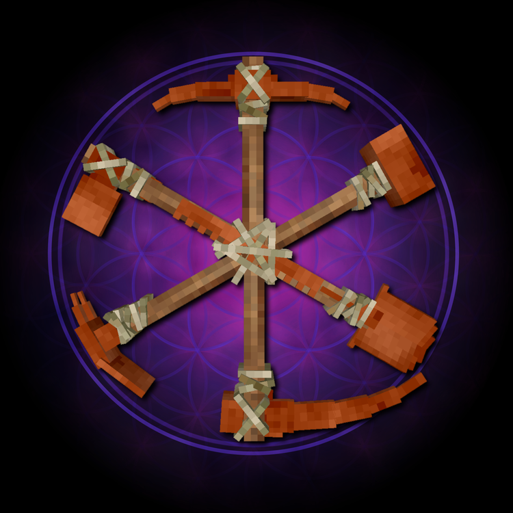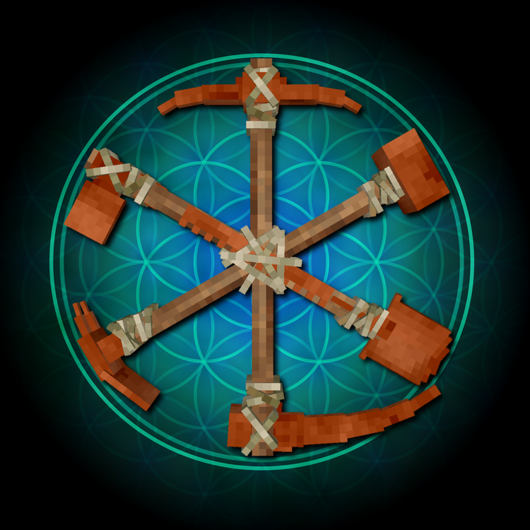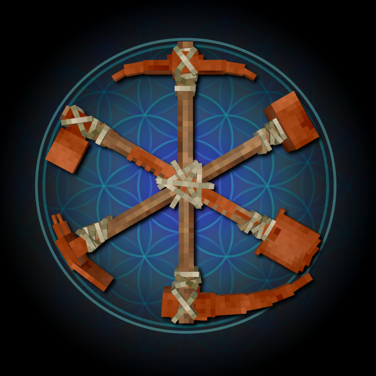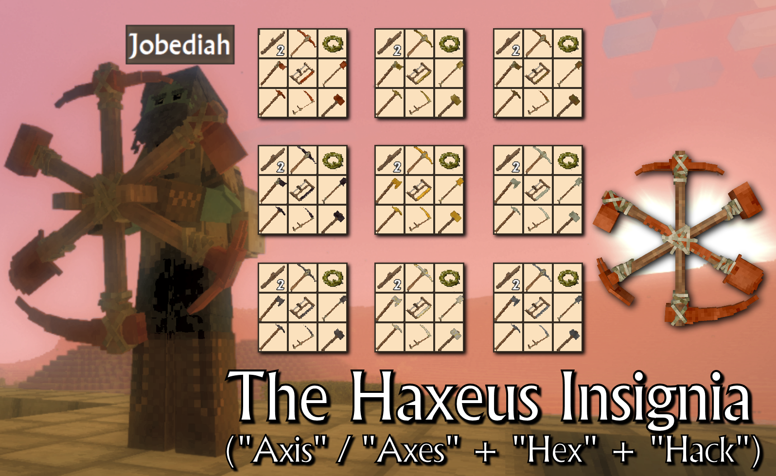 I was very tempted to post a picture of this right away, in my excitement of 'discovering' this artifact. I originally only wanted to make it as a piece of artwork for using online. Anything circular makes a great avatar, after all. But then I realized what I would have been told by probably everyone: that this would make an absolutely fantastic decoration piece within the game. Not to mention a symbol to put on a flag or tapestry as I planned. Then in my excitement I almost posted the beta version of the mod before I even figured out the best way to handle the crafting recipes. Then I decided to take my time and just do it right. Before I begin rambling for far too long, I'll explain the big question. As the title says, I have dubbed this Seraphic symbol the "Haxeus". It is a portmantau of the words "Axis" or "Axes", plus "Hex" meaning "Six", and "Hack" meaning "Whack", or "Chop", or "Dig", etc. Because after all, every one of these tools could be described as "hacking". Especially the hacksaw, which, ironically, I didn't think would fit with this shape until I used only the blade. (At first I tried including the whole saw, and the only place to put it was to make it a mouth, and the axe and shovel become eyes, and it was too freakish and confusing. I'd rather not even mention it, I want this post to be taken seriously.) I can't remember how long ago it was when I first had the faint idea for the basic idea of a symbol involving tools, but I'm realizing now that it might have been quite a while ago. I forgot about it completely, because didn't think I'd be able to pull anything off that would be good enough and unique enough. By that I mean something that's not an obvious ripoff of other logos and symbols. And yet I think this thing somehow turned out perfect. It combines almost all of the construction tools arranged in a circle, and the lines of the handles become a set of 3-Dimensional X-Y-Z axes. And, not only do the tools fit together perfectly like this, the best way to arrange them was at an angle that is appropriate for each tool -- they look like they're in the middle of being used. I didn't even plan on this, and only noticed it afterwards, which another reason for my enthusiasm. To elaborate (as if it's necessary): The Pickaxe needed to be on top anyway, being that it's the key to acquiring resources to craft the rest of the tools, but it's the most appropriate place, as it's the one tool used by swinging it high over your head. The Axe tends to be moving at this downward/horizontal angle when it's about to chop, likewise, the Hammer strikes downward onto an anvil. And of course the Scythe, Shovel, and Hoe face downward, as you're always using them down toward to the soil. The Saw blade I could only include by hiding it in the center, but there's a reason for that, as you can guess. More on the hidden letters later. Anyway, part of what took so long is that I was debating whether to make it work with any combination of metals, but I decided to keep it simple and require all 6 tools to be the same metal. For one thing, I don't know if we want to deal with an item called "haxeus-copper-tinbronze-blackbronze- copper-tinbronze-copper", even if the variant system does handle it properly. It's meant to be a work of art, so maybe consistency is better. Maybe if enough people want it variant versions will be possible, but for now, here are all the available forms of single-metal Haxeus: Copper, Tin Bronze, Bismuth Bronze, Black Bronze, Gold, Silver, Iron, Meteoric Iron, and Steel. I also debated a lot as to what to call it, for a while I wanted to pronouce it like "axes", but "Haxes" looks like "hacksiz" instead of "hacks-ease" like I wanted. But more importantly I wanted to make it sound like a real Latin word. I've also considered other words to add on, like "Locus Haxeus", 'locus' meaning location. Or "Haxeus Cartesia", a reference to the Cartesian coordinates. I'm willing to consider other secondary names too, but I think I've settled on "Haxeus". I don't know why this idea is so exciting to me, but it turned out perfect on so many levels. I know part of the reason is that it's a mod that everyone can install and appreciate because it basically doesn't change the gameplay progression or challenge in any way whatsoever. But on top of that, there's so much meaning behind every aspect of this thing, and that is required for any good symbol. But even better, a lot of it just happened this way through serendipity, much like the things you encounter in Vintage Story once in a while. In other words, I'm not exaggerating, it genuinely feels like I discovered something, as if this was an ancient symbol buried deep in the world of this game. After living in the world of Vintage Story long enough, it was only a matter of time that someone would make it, so it genuinely feels like it arose naturally out of the culture of this world. I also love the idea that in order to make one of these, you have to craft and/or acquire all of these tools, and then use up the tools while remembering not to let them break, and then use up inventory space just to take them home, just to build this symbolic trinket of achievement. It's a satisfying accomplishment as well as an attractive centerpiece for your coffee table. Of course, it's designed for more than a table centerpiece, and can be mounted on any wall or ceiling. It will be up to you not to let it clip into nearby walls or ceilings, as it takes up approximately 140% of a single block. You can still fit a Torch or Lantern right next to them, which will probably be something you end up doing to draw attention to your new wall ornament(s). Speaking of ornaments, which are usually hung down from something, I'm not sure if it should hang downward if placed on a ceiling, nor do I know how to make that possible in regards to rotation. For now it just mounts flat against the ceiling. If you have played a long time already, and you've thrown away a lot of brok