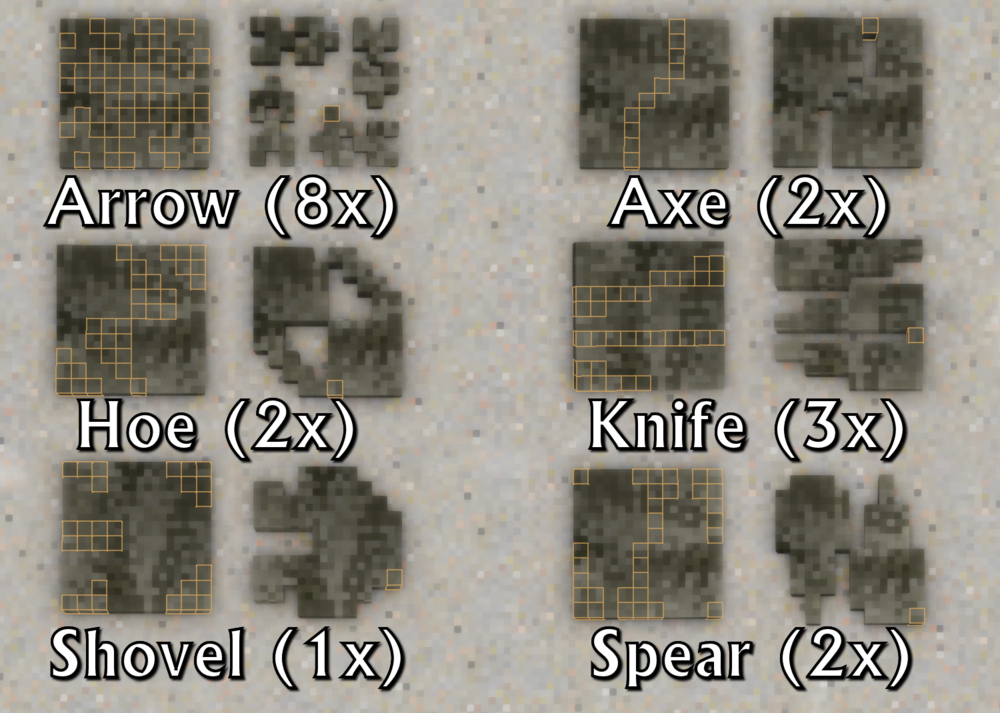 This is just a very simple mod that replaces the Knife Knapping recipes. I discovered that if you fit two of them in opposite directions, they're the perfect size that the blades can be separated, and then there's just enough room to fit a third blade. Now I find it far less frustrating if the stone knives feel a bit too weak, since early game involves so many of them. But to get an extra one helps a lot, because if you're not knapping knives so often, having to knap other tools won't feel as much of an interruption. Now you can use all that time you save on knapping for napping. KnifeKnapping1.0.0.zip