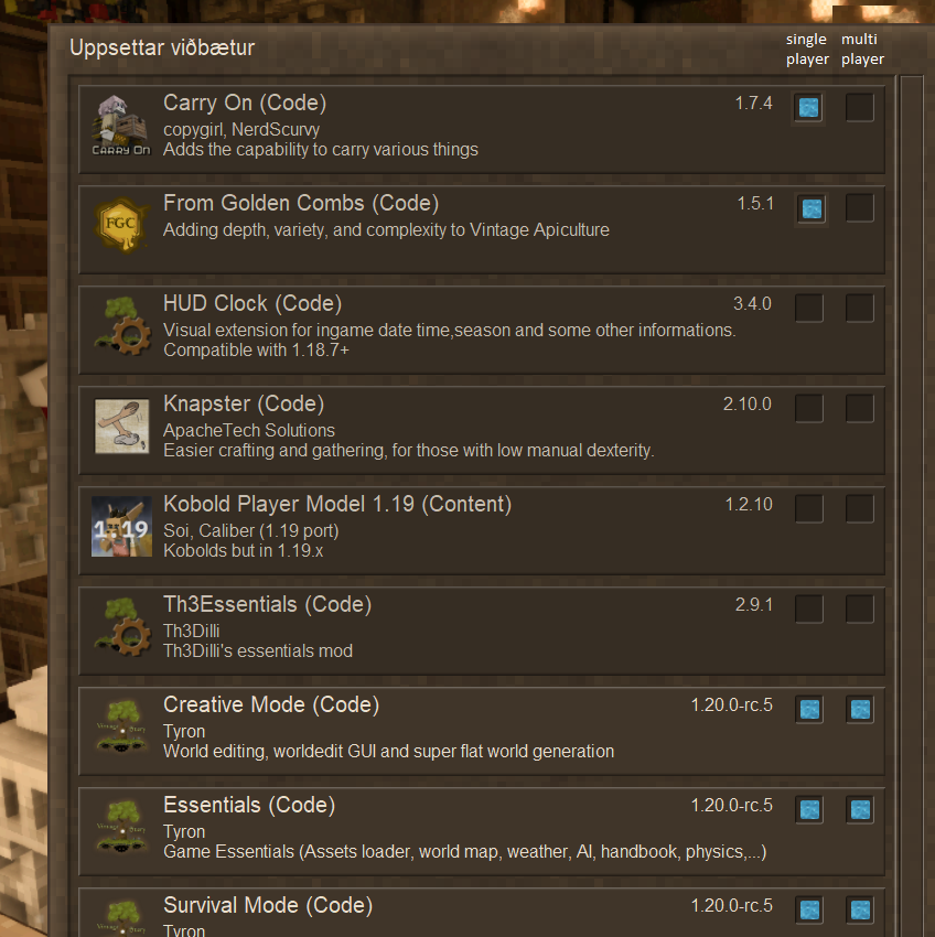Yeah, the Simple HUD Clock mod is such a nice thing to show all the basic info you might be interest in without having to open your character screen every time to check the weather and rift activity. Specially love the neat way it implements an icon to indicate if you are in a room or not, and what type of room. And perhaps From Golden Combs for better beekeeping (reusable hives), but would note that bees don't swarm from those hives, only from skeps and natural hives. You place populated skeps inside them to make the hives work. No more abuse of those poor bees by destroying the hives to harvest honey. The Carry On mod feels so natural to use, letting you rearrange containers by lifting them up, and doing the same action without focusing on any block (such as just looking at the sky) does place whatever you are carrying onto your back so you can use your hands. But just the organizing ability of this is wonderful, should totally just be part of vanilla. And for some quality of life that doesn't really take away from the feeling of actually making things by hand, is Knapster. Essentially just auto selects what voxels are being placed/taken away when knapping, clay forming or smithing, but still feels like you are making the item yourself even if you are not manually pointing at every voxel. Though you can always alter the speed of the assist with setting commands, but that can take away from the vanilla feeling (such as making panning take no time, a 1 click action). I personally make it place more than 1 voxel at a time (it speeds things a bit) and love this feature, it appears as an optional mode for actions that let you choose a mode by pressing F (such as clay forming and smithing). I actually enjoy smithing without the assist more, it's such a interesting process. That is what I use when playing -