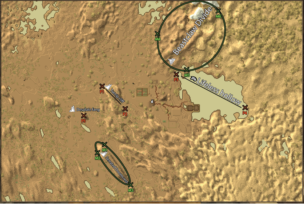 So regarding 2 manual algorithms to name 2D features on the map - here's the first. The user provide only two points. So for example, P1-P2. These points would be then connected by an invisible line, in which the label for a feature should be fitted by adjusting font size within limits, say from 8 to 18. Names ideally should be generated from a library - adj+noun, offering 3-5 options or waiting for user to write its own, while pictogram next to the name for user themselves to choose - just one of a few types (cliff, single mountain, mountain range, valley, plateau, large body of water for ocean/lake, swamp, etc). On screenshot P1-P2 - label defined by me because that's the feature name we are using through our >100 hour base, while P3-P4 is something I'd like to see coming from the generator. If distance on the map between points is short and text falls below predefined font size, text label should be hidden from the map.