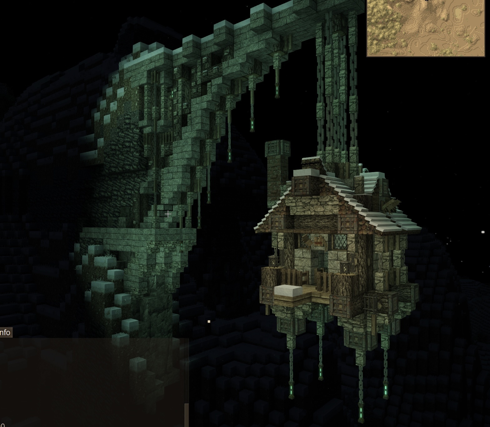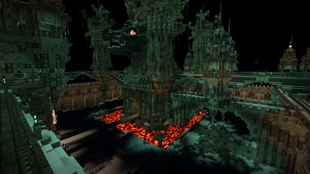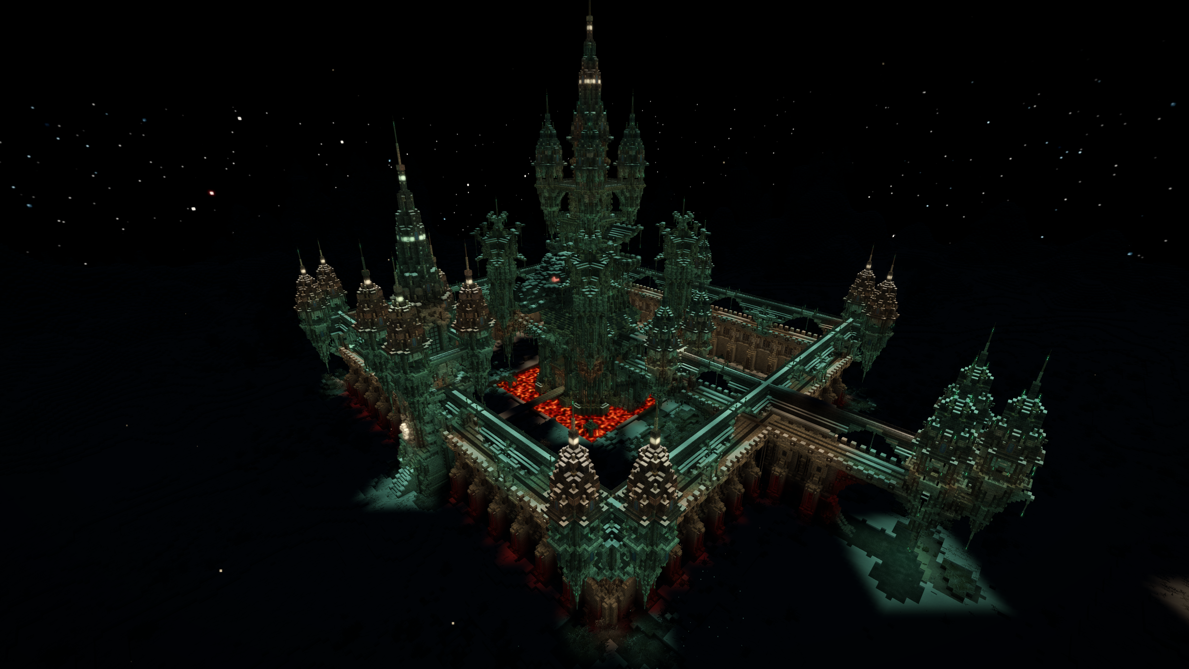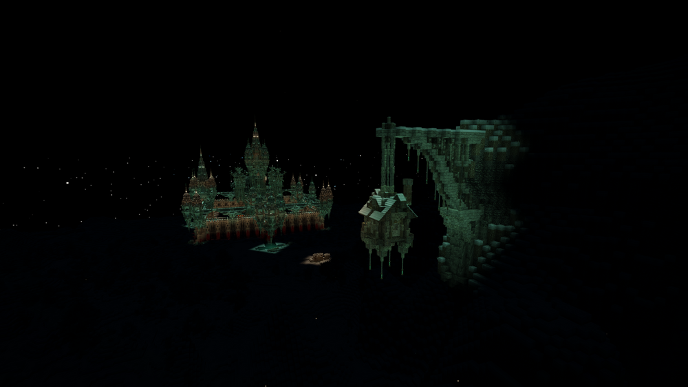 3. In these pictures you can see my server spawn nearing completion along with my server home hanging off the cliff in the foreground. Pics taken at night. The build has taken a while, didn't really count the days or hours. Was built in creative because I don't have the time to build something like this in survival. Now to set about building the remaining spawn structures.
