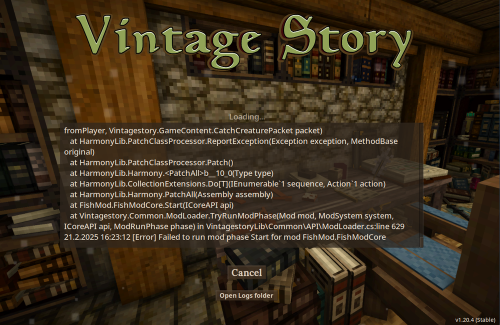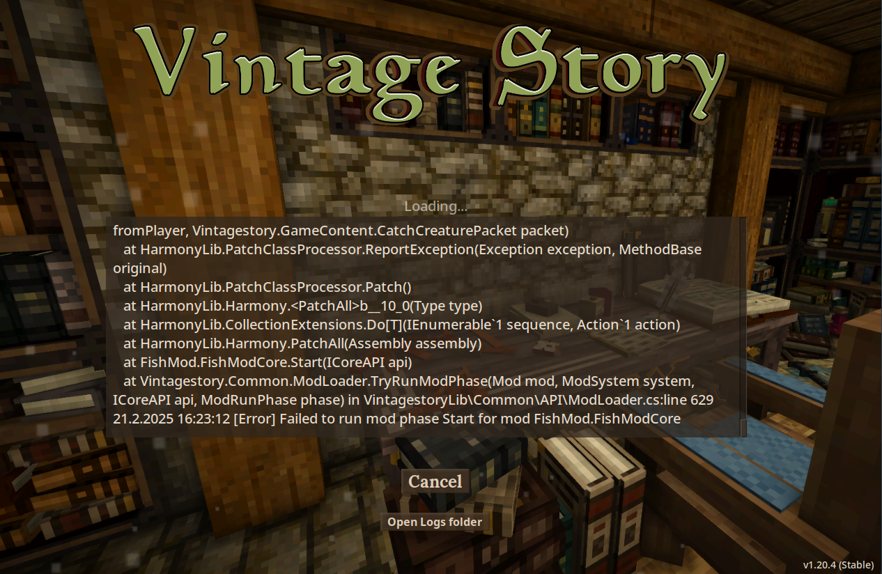 Whenever I start up my save file, I get a load of text with a bunch of mod errors and stuff. Somebody told me I could find this to copy-paste in server.main.log. My mods aren't working properly, and I have no idea what any of this means. Can someone please help me? Thank you in advance. 21.2.2025 18:17:43 [Notification] Server logger started. 21.2.2025 18:17:43 [Notification] Game Version: v1.20.4 (Stable) 21.2.2025 18:17:43 [Event] It begins... 21.2.2025 18:17:43 [Event] Launching server... 21.2.2025 18:17:43 [Event] It senses... 21.2.2025 18:17:43 [Event] Server v1.20.4, network v1.20.6, api v1.20.0 21.2.2025 18:17:43 [Notification] Entering runphase Initialization 21.2.2025 18:17:43 [Event] Loading configuration... 21.2.2025 18:17:43 [Notification] Entering runphase Configuration 21.2.2025 18:17:43 [Notification] Loading savegame 21.2.2025 18:17:43 [Notification] Loaded existing save game data. Playstyle: surviveandbuild, Playstyle Lang code: preset-surviveandbuild, WorldType: preset-surviveandbuild 21.2.2025 18:17:43 [Notification] Savegame /home/******/.config/VintagestoryData/Saves/vintage village valley.vcdbs loaded 21.2.2025 18:17:43 [Notification] World size = 1024000 256 1024000 21.2.2025 18:17:43 [Notification] Start discovering assets 21.2.2025 18:17:43 [Notification] Found 1 base assets in category blocktypes 21.2.2025 18:17:43 [Notification] Found 0 base assets in category itemtypes 21.2.2025 18:17:43 [Notification] Found 28 base assets in category lang 21.2.2025 18:17:43 [Notification] Found 0 base assets in category patches 21.2.2025 18:17:43 [Notification] Found 24 base assets in category config 21.2.2025 18:17:43 [Notification] Found 0 base assets in category worldproperties 21.2.2025 18:17:43 [Notification] Found 49 base assets in category sounds 21.2.2025 18:17:43 [Notification] Found 95 base assets in category shapes 21.2.2025 18:17:43 [Notification] Found 140 base assets in category textures 21.2.2025 18:17:43 [Notification] Found 0 base assets in category recipes 21.2.2025 18:17:43 [Notification] Found 0 base assets in category worldgen 21.2.2025 18:17:43 [Notification] Found 3 base assets in category entities 21.2.2025 18:17:43 [Notification] Found 340 base assets in total 21.2.2025 18:17:43 [Event] Building assets... 21.2.2025 18:17:43 [Notification] Entering runphase LoadAssets 21.2.2025 18:17:43 [Notification] Will search the following paths for mods: 21.2.2025 18:17:43 [Notification] /usr/share/vintagestory/Mods 21.2.2025 18:17:43 [Notification] /home/******/.config/VintagestoryData/Mods 21.2.2025 18:17:44 [Warning] [cuniculture] Dependency 'game': Failed parsing version string '1.20.*' at index 5: Expected PATCH version number, found '*' (best guess: 1.20.0) 21.2.2025 18:17:44 [Warning] [kilntimeviewer] Dependency 'game': Failed parsing version string '1.19.*' at index 5: Expected PATCH version number, found '*' (best guess: 1.19.0) 21.2.2025 18:17:44 [Notification] Found 35 mods (5 disabled) 21.2.2025 18:17:44 [Notification] Mods, sorted by dependency: AAAEntityCorrect, aculinaryartillery, africanmonitorlizards, asianmonitorlizards, bandedgeckos, beardeddragons, domesticanimaltrader, viveriidae, leopardgeckos, long-term_food, sticksfromfirewood, torchrelitcontinued, game, cuniculture, expandedfoods, fromgoldencombs, grassiergrass, herbarium, kilntimeviewer, petai, smithingplus, creative, survival, bugnetcompatibility, cats, feverstonehorses, shearlib, wildcraftfruit, wolftaming, wool 21.2.2025 18:17:44 [Notification] Instantiated 143 mod systems from 30 enabled mods 21.2.2025 18:17:44 [Notification] External Origins in load order: modorigin@/usr/share/vintagestory/assets/creative/, modorigin@/usr/share/vintagestory/assets/survival/, mod@AAAEntityCorrect_0.0.3.zip, mod@ACulinaryArtillery 1.2.3.zip, mod@africanmonitorlizards_107.zip, mod@asianmonitorlizards_101.zip, mod@bandedgeckos_120.zip, mod@beardeddragons_100.zip, mod@domesticanimaltrader1.1.0.zip, mod@FotSA-Viverridae-v1.0.1.zip, mod@leopardgeckos_122.zip, mod@Long-term food v0.2.1.zip, mod@SticksFromFirewood.zip, mod@torchrelitcontinued1.0.2.zip, mod@Cuniculture_v1.0.3.zip, mod@ExpandedFoods 1.7.4.zip, mod@FromGoldenCombs-1.20-v1.8.11-rc.5.zip, mod@GrassierGrass_v1.0.0.zip, mod@herbarium_1.4.0.zip, mod@petai_v3.0.1.zip, mod@smithingplus_1.2.2.zip, mod@cats_v3.0.0_petai_v3.0.+.zip, mod@FeverstoneHorses-v1.6.1-1.19.x.zip, mod@shearlib-1.1.2.zip, mod@wildcraftfruit_1.3.0.zip, mod@wolftaming_v3.0.3_petai_v3.0.+.zip, mod@wool-1.5.4.zip 21.2.2025 18:17:44 [Notification] Found 546 external assets in category blocktypes 21.2.2025 18:17:44 [Notification] Found 484 external assets in category itemtypes 21.2.2025 18:17:44 [Notification] Found 157 external assets in category lang 21.2.2025 18:17:44 [Notification] Found 529 external assets in category patches 21.2.2025 18:17:44 [Notification] Found 126 external assets in category config 21.2.2025 18:17:44 [Notification] Found 28 external assets in category worldproperties 21.2.2025 18:17:44 [Notification] Found 572 external assets in category sounds 21.2.2025 18:17:44 [Notification] Found 6777 external assets in category shapes 21.2.2025 18:17:44 [Notification] Found 10042 external assets in category textures 21.2.2025 18:17:44 [Notification] Found 770 external assets in category recipes 21.2.2025 18:17:44 [Notification] Found 582 external assets in category worldgen 21.2.2025 18:17:44 [Notification] Found 94 external assets in category entities 21.2.2025 18:17:44 [Notification] Found 38 external assets in category compatibility 21.2.2025 18:17:44 [Notification] Reloaded lang file with mod assets 21.2.2025 18:17:44 [Notification] Mod Config successfully loaded. 21.2.2025 18:17:44 [Error] [aculinaryartillery] An exception was thrown when trying to start the mod: 21.2.2025 18:17:44 [Error] [aculinaryartillery] Exception: Patching exception in method static System.String Vintagestory.GameContent.GuiHandbookItemStackPage::PageCodeForStack(Vintagestory.API.Common.ItemSta