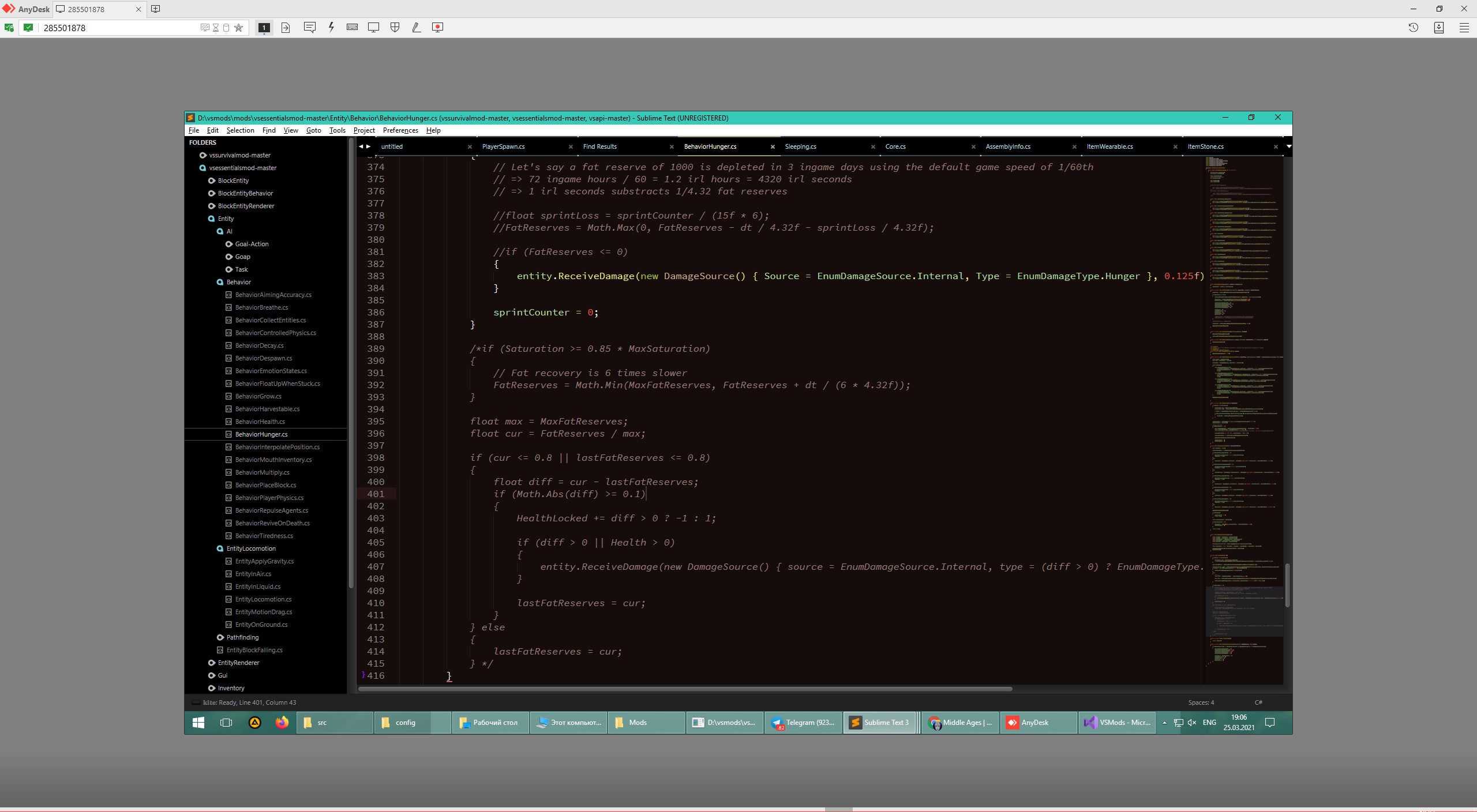 20. VS API -> Entity - >BehaviorHunger.cs This method calls when player respawns and get healed by Revive() in API lib. public override void OnEntityReceiveDamage(DamageSource damageSource, float damage) { if (damageSource.Type == EnumDamageType.Heal && damageSource.Source == EnumDamageSource.Revive) { SaturationLossDelayFruit = 60; SaturationLossDelayVegetable = 60; SaturationLossDelayProtein = 60; SaturationLossDelayGrain = 60; SaturationLossDelayDairy = 60; Saturation = MaxSaturation / 2; VegetableLevel /= 2; ProteinLevel /= 2; FruitLevel /= 2; DairyLevel /= 2; } } VS API Entite -> Entity.cs This method heals when player was respawned public virtual void Revive() { Alive = true; ReceiveDamage(new DamageSource() { Source = EnumDamageSource.Revive, Type = EnumDamageType.Heal }, 9999); AnimManager?.StopAnimation("die"); IsOnFire = false; foreach (EntityBehavior behavior in SidedProperties.Behaviors) { behavior.OnEntityRevive(); } } How override this methods?
