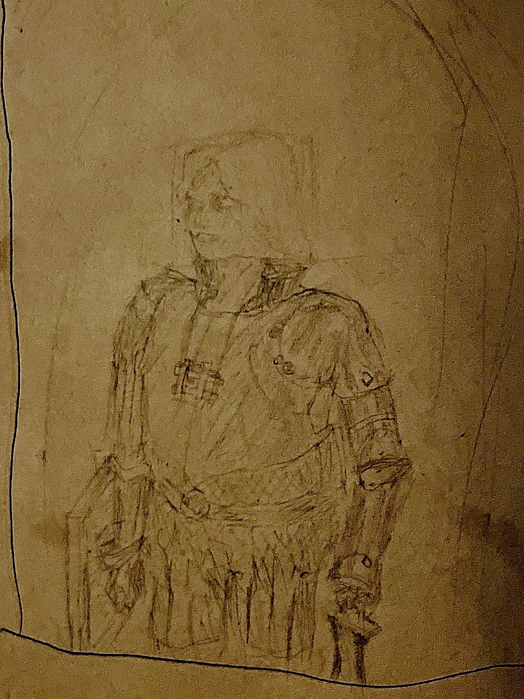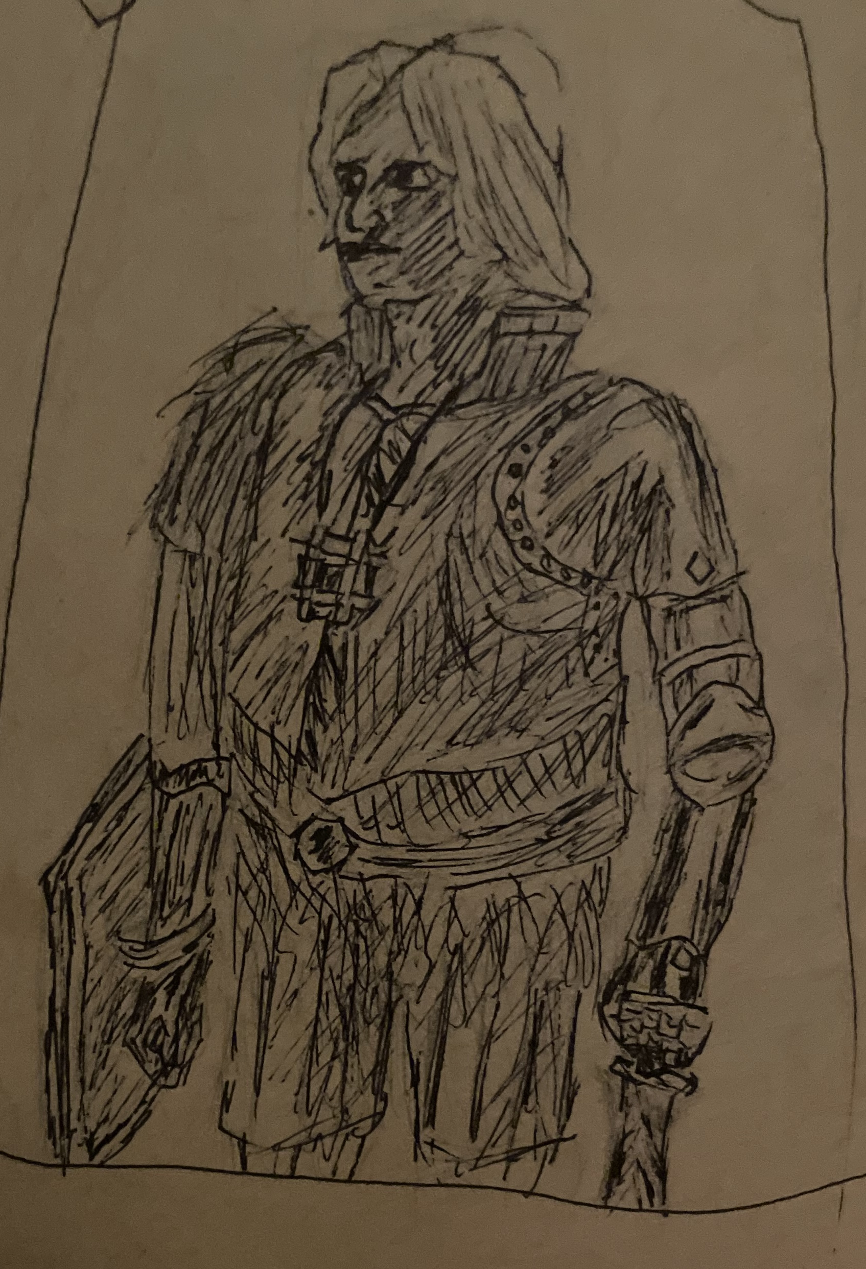This one was honestly a bit of a failure, didn’t turn out how I really wanted it to, buuut I worked on it for a few hours, so I decided to not waste all of that effort and still put it on here. John Vintage in his refurbished blackguard armor This was the rough sketch -hence why it was so light that I had to adjust the photo so you could see it- but it turned out better than the inked one, so I’m putting it front and center. The inked version is pretty bad so I decided I am going with spoiler-ing it for now. For context on why this is my celebratory work: I’ve had a world going on for 10 some months now, in 1.20.10, and I just had finished all of the available story content. I’ve amassed 210 hours in it, and over that time I’ve grown attached to my seraph, who me and my friends refer to as “John Vintagestory”. Despite the non seriousness of his name, over time I’ve actually crafted quite a character out of my goofy grey guy. I’ve amassed a solid number of entries into a journal google doc from his point of view, as well as a few other smaller entries. From this I have seen it through thick and thin with ol’ John, and by the end I was determined to see his journey through, didn’t matter the missteps and annoyances. Then, after an embarrassingly long time in the third story structure, I had completed it! (partially thanks to what I think was a bug? I’m still not sure) And now that his journey is done, I hope to see him off to retirement in a simple life. I hope to redo this in a few months when my skills are more refined so I can give him a proper send off.