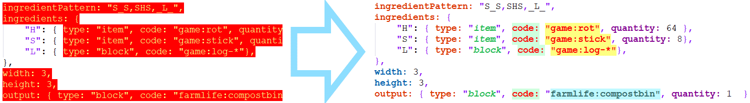 Have you added "arcotton:" to the item? Try without. The cotton-stuff is in "game:" domain. Like in cottonsack.json: cottontwine is in "arcotton:" (i should maybe move all in game: ...) The cotton*-blocks are all without prefix. It can replace linen 1:1. { ingredientPattern: "T L", ingredients: { "T": { type: "item", code: "arcotton:cottontwine" }, "L": { type: "block", code: "cotton-*" } }, width: 1, height: 2, output: { type: "item", code: "cottonsack" } } waxed cotton recipe (comes with next version): "ingredients": { "C": { "type": "block", "code": "cotton-normal-down" }, "W": { "type": "item", "code": "beeswax" } },