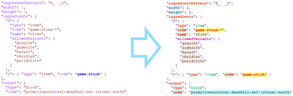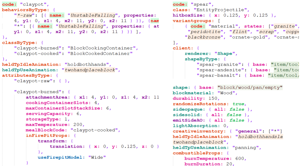 For better visibility and debugging (see samples below) i created an own overlay for json files for Notepad++ based on Vintage Story keywords. Some keywords are sepcially colored like "game:"-Items and some of mod items (if someone has a list of mod IDs > please send these to me so i can add these so all mod IDs are highlighted correctly) Download File Date: 2021-03-20 npp_vintagestory_json.xml News 2021-03-20 More keywords added. Actually over 450! If already using: delete the existing user language "vintagestory" first before importing the new file. After import restart Notepage++. 2021-03-13 Added additional Mod ID's (22 now) + several keywords (especially from shape json files) Actual implemented Mod-ID's acorns arplants betterstairs carrycapacity expandedfoods extrachests farmlife game helvehammerext hudclock linenbackpack medievalexpansion morerecipes primitivesurvival survivalcats usefulstuff weaponpacka wildfarming workbenchexpansion xeffects xlib xskills How to install - Menu "Language" - "User defined language" >> "Define your language" - Click on "Import..." and select the downloaded xaml-file - restart Notepad++ - now "vintagestory" is added to the Language-menu at the bottom - Thats all Up now every json file will be automatically formatted by these settings Preview compostbin.json from Farmlife-Mod - On the left the default JSON language settings of Notepad++ - on the right the new one deadfall.json from PrimitiveSurvival-Mod. E.g. here are "game:" strings highlighted in red-yellow - Mod names are highlighted in blue-cyan