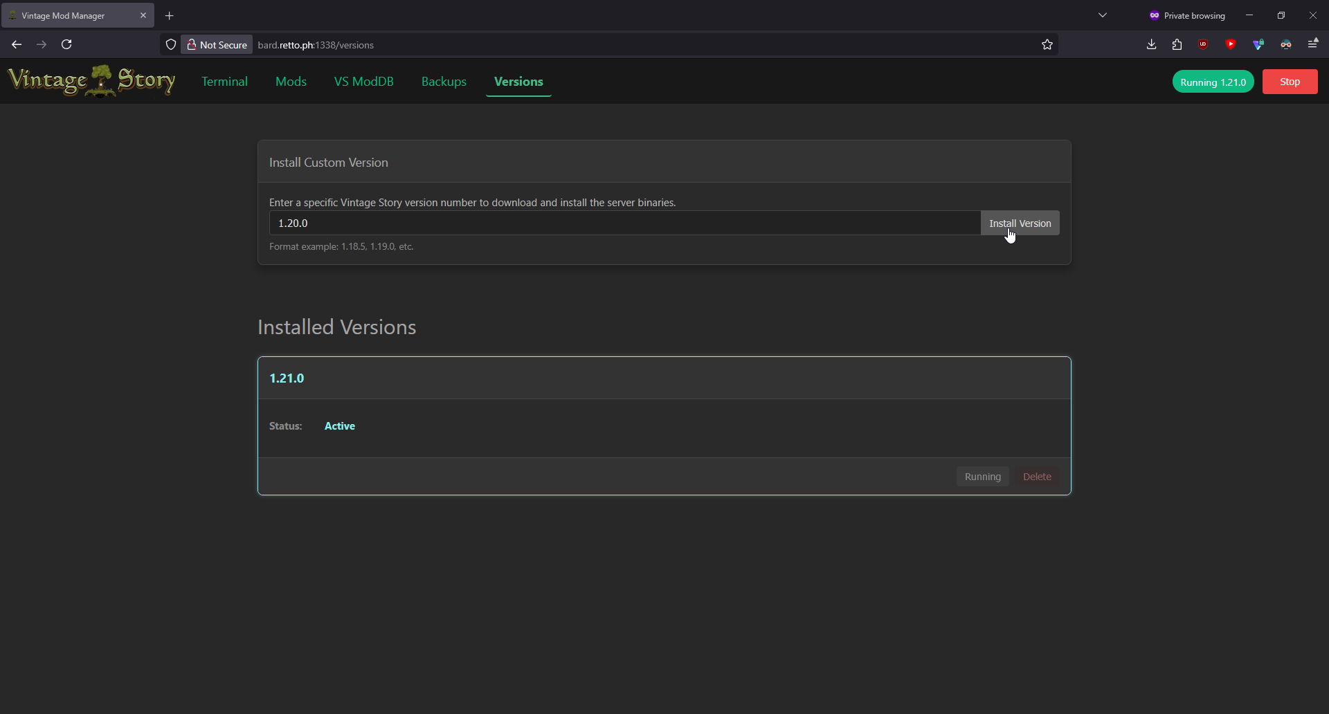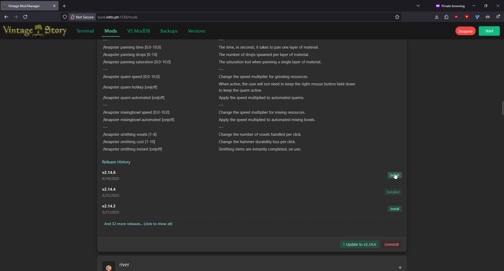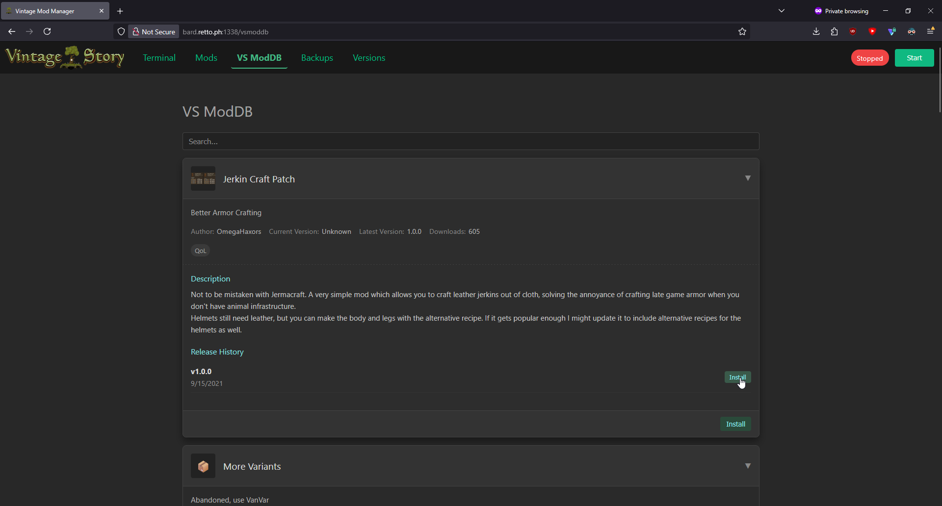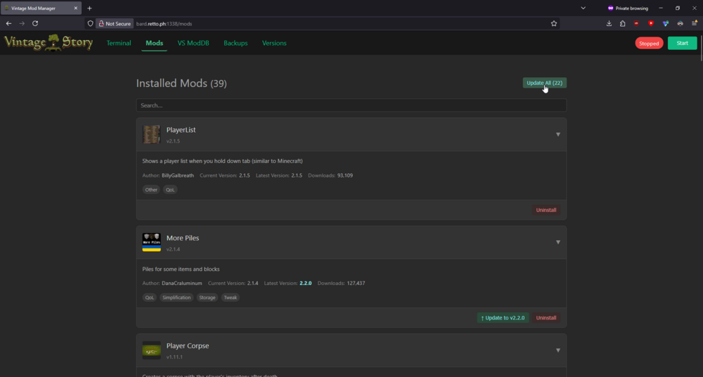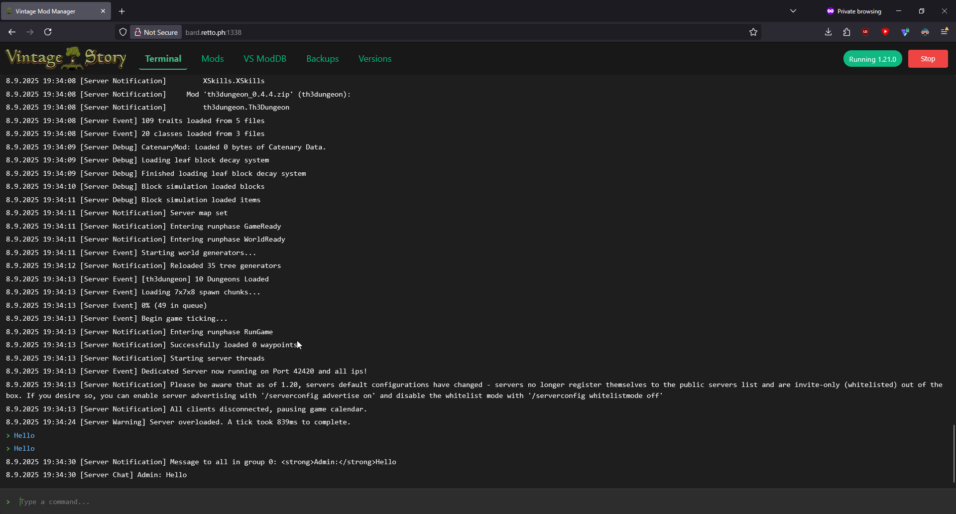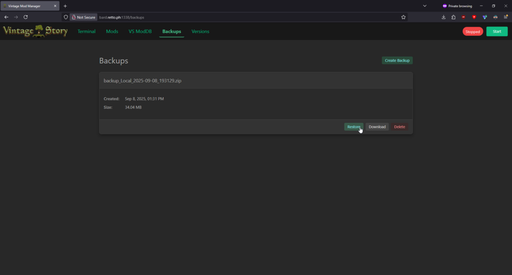 1. Unsatisfied with existing Docker solutions for hosting my own server, I decided to build my own. Somewhere along the way, I lost the plot and ended up creating a full-fledged server management web portal. It includes features like backup creation & restoration, mod installation & updates, version switching, and direct terminal access. I built this over a couple of weekends, so it's very experimental. Automatic backups are created every time you install or update a mod. These backups include save files, mods, and mod configurations. Security note: The web portal is currently public and has no authentication. Make sure to keep it locked behind your firewall. I thought some people might find this interesting, if not useful. If you're brave enough to test it, you might help shape its future development. I'll keep working on it at a small scale for my own use, but if there’s interest, I’m open to expanding its functionality. Let me know what you think! Images Docker Command Just run the following to get it running. All your VintageStory data, server versions, and backups will be located in the .data/vintage-story volume. docker run -d \ --name vintage-server-manager \ --restart unless-stopped \ -p 42420:42420 \ -p 1337:8080 \ -v .data/vintage-story:/app/vintage-story \ git.retto.ph/tony/vintage-server-manager:latest Source Code: https://git.retto.ph/tony/VintageServerManager Planned Features Authentication. Right now the web portal is publicly accessible. Not a priority as my use case is self hosting and i've simply locked the portal behind my firewall. Automated backups Mod configuration editor Save file management ...
