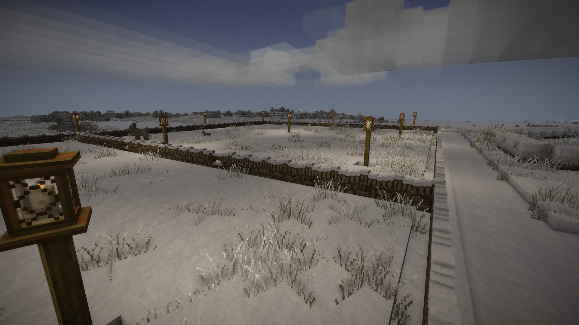 To disable them despawning I choose to put some lanterns up, something I wanted to do anyway to avoid having drifters in my base. This also lead me to check out the actuall mechanic behind light and spawns/despawns. Lanterns have a range of 18 (16 as I place them 2 squres above the ground for astethic reasons), that makes a diamond shape as a diagonal cube costs 2 range (instead of circle (radius) or square (cost of 1 range). That would force me to put a lamp every roughly 14 squares as well as additional lamps in between but moved up by 6 and 7 to the side (picture bellow).