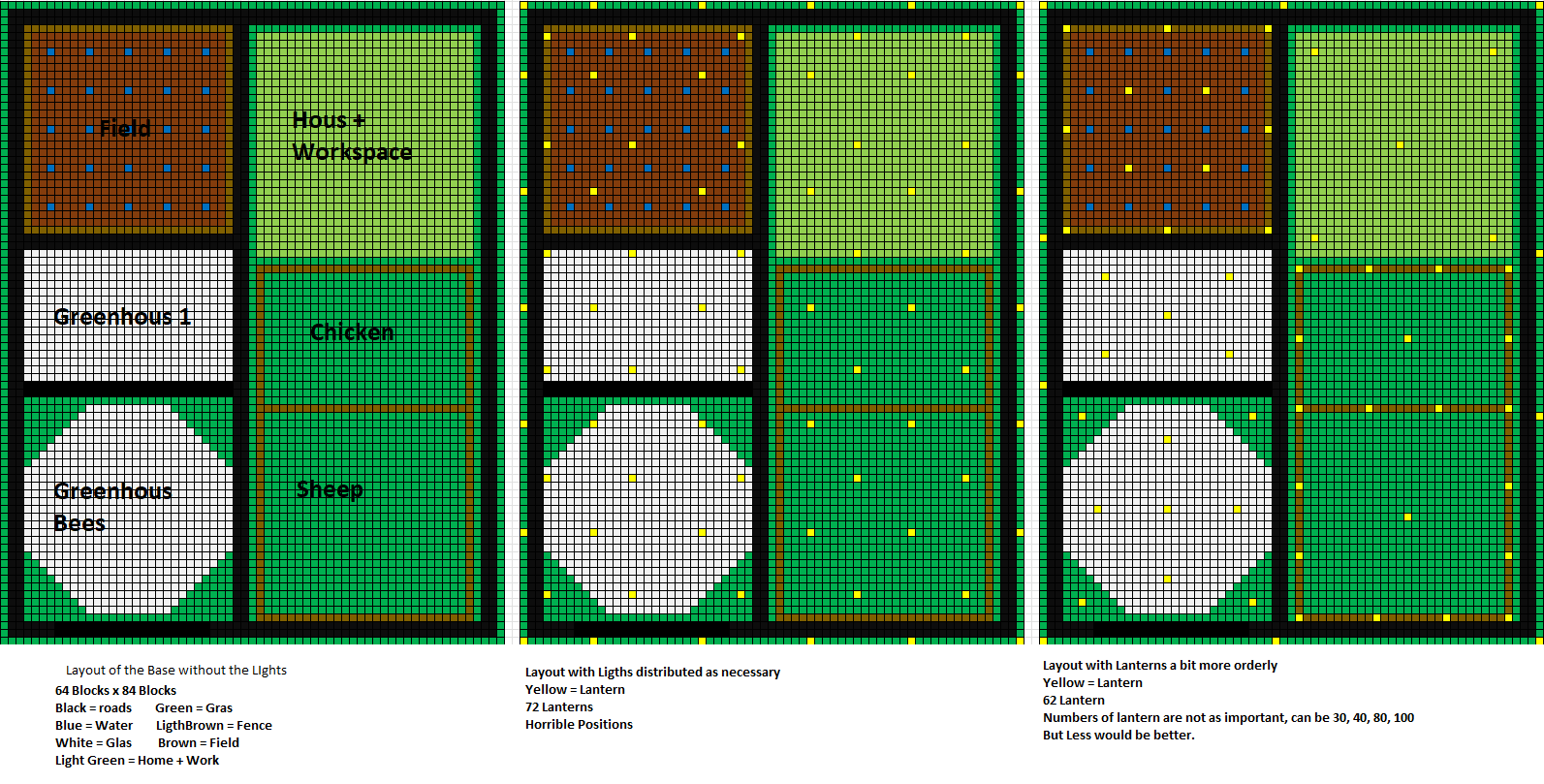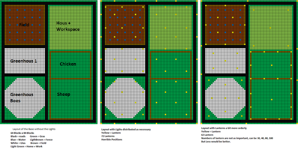 For that I carefully mapped out my wished for base layout on paper and then prepared a piece of land not to far from my original base. It contains a space for my Home and workshops (underground cellar underneath), 2 pastures for future chicken and sheep, a normal field, a greenhouse for crops and a greenhouse for bees and maybe a fruit tree depending on what trees I find and if one of them might need it.