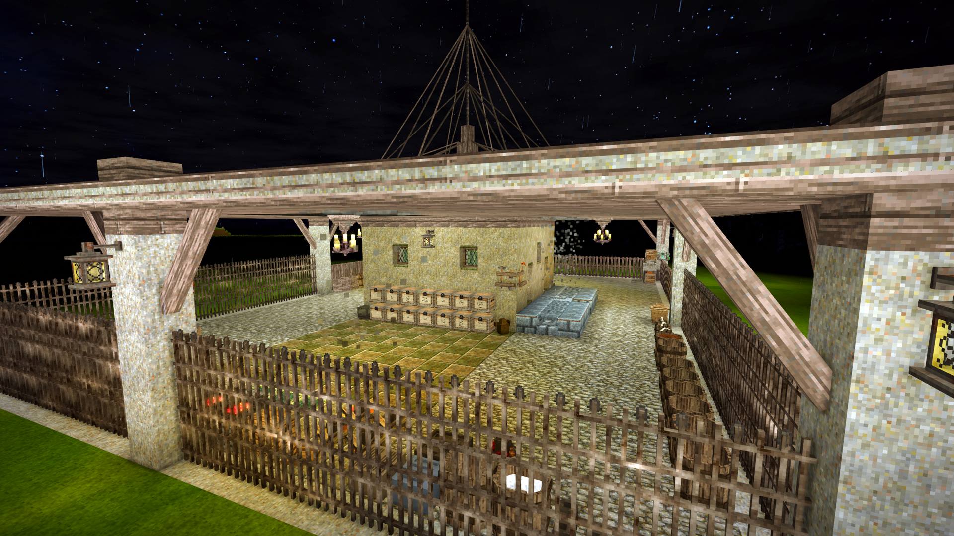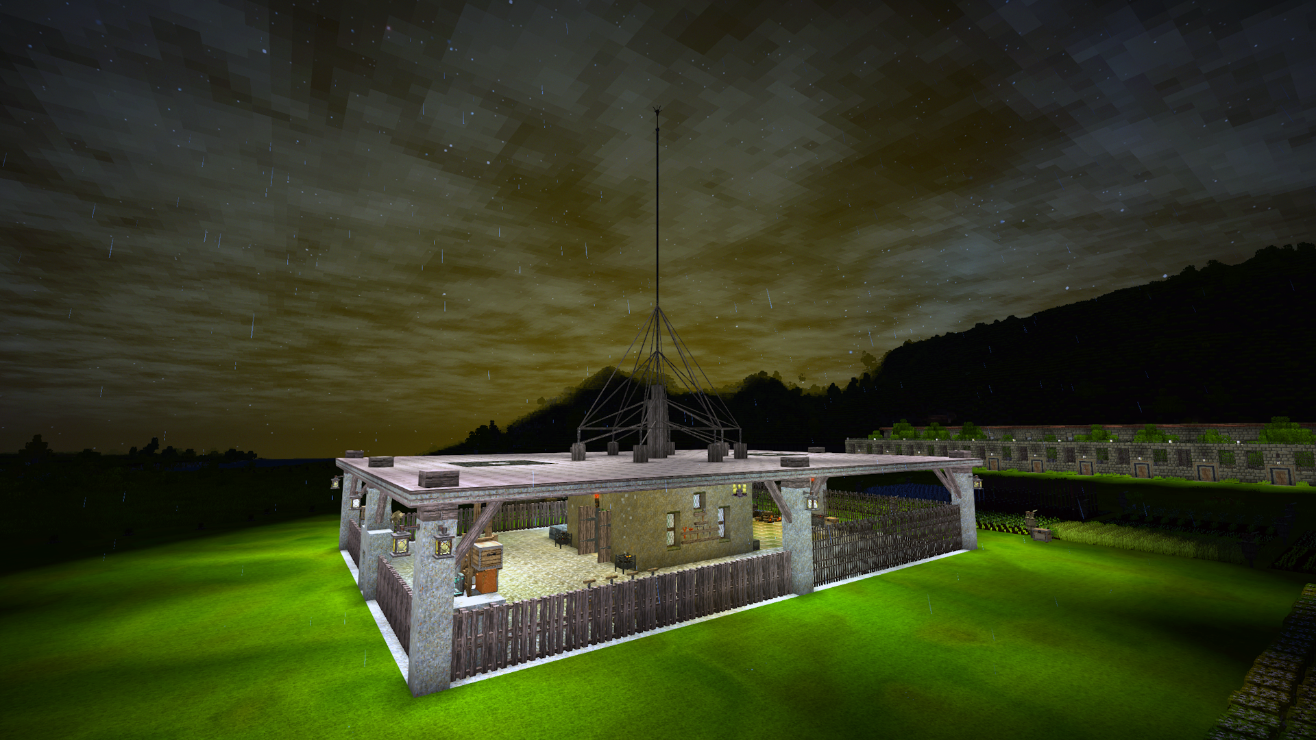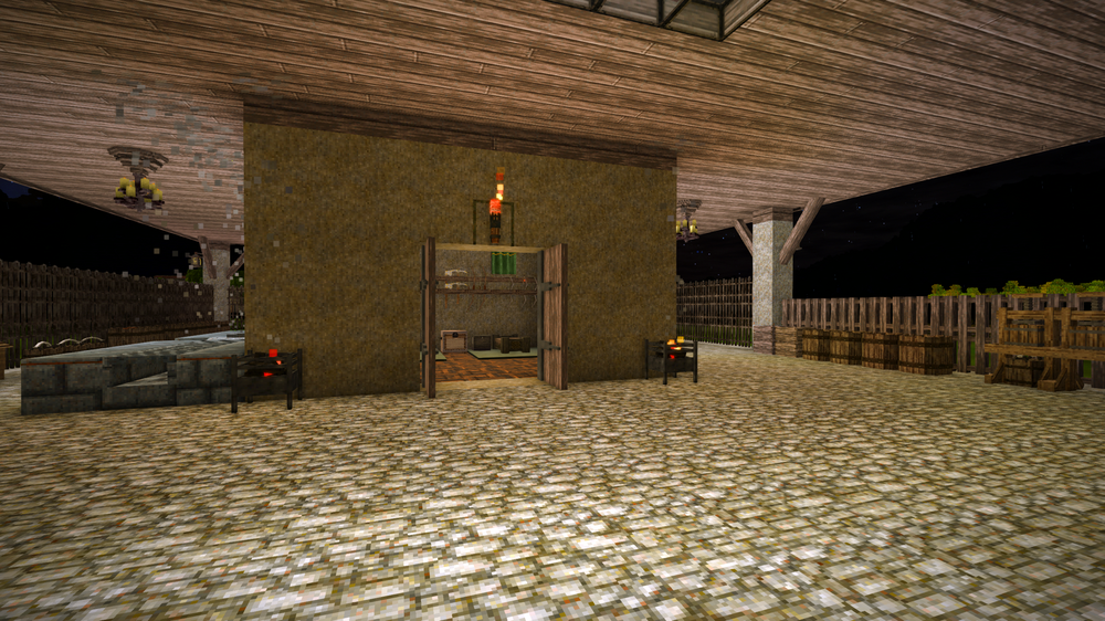 Thanks very much. The clouds are from the Fancy Clouds 2D mod. The Animal Pen's roof is from the One-Roof mod. The 3x3 double-door is from Medieval Expansion 1.20 Patch +. The 3x3 is called a Gate in the mod. ( in-case you may want to search for it ) Most of the other things are just Vanilla chiseled stuff. I'm still looking for a mod that provides smooth angled slope blocks, so if you can recommend anything, that'd be great! Thank you!