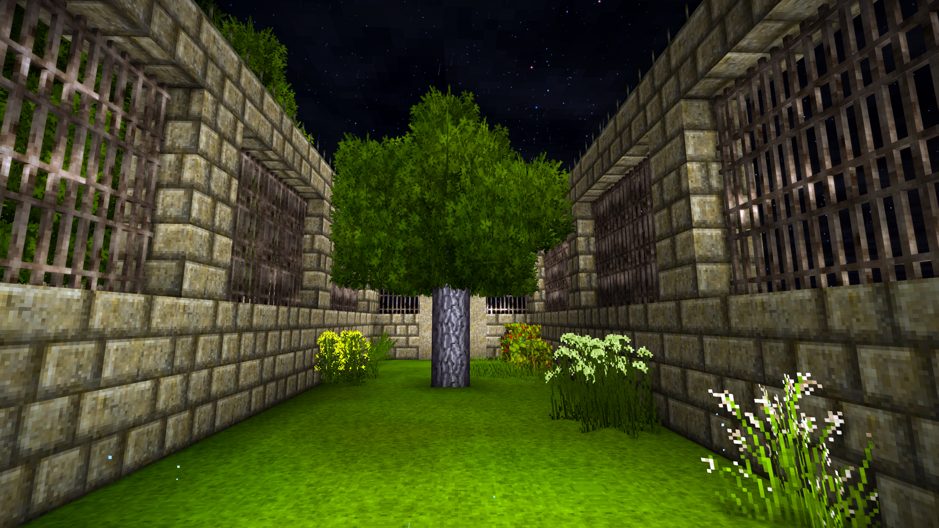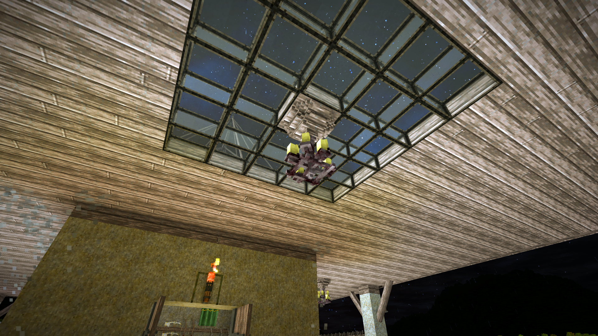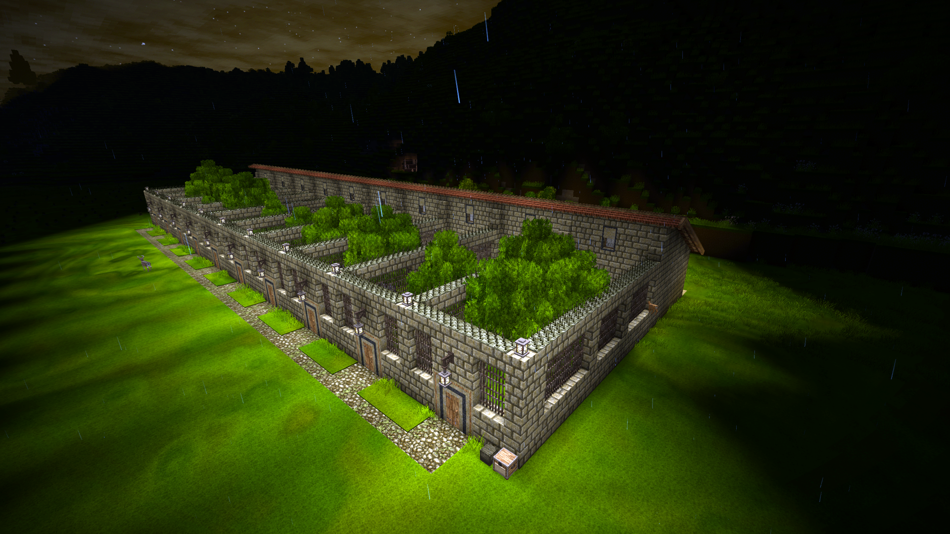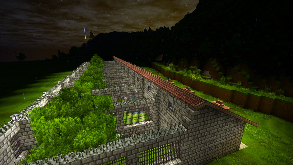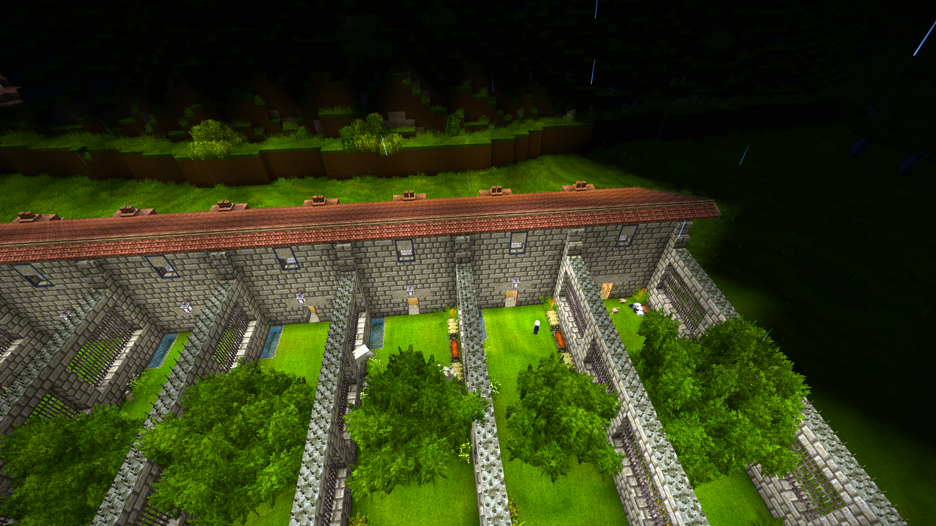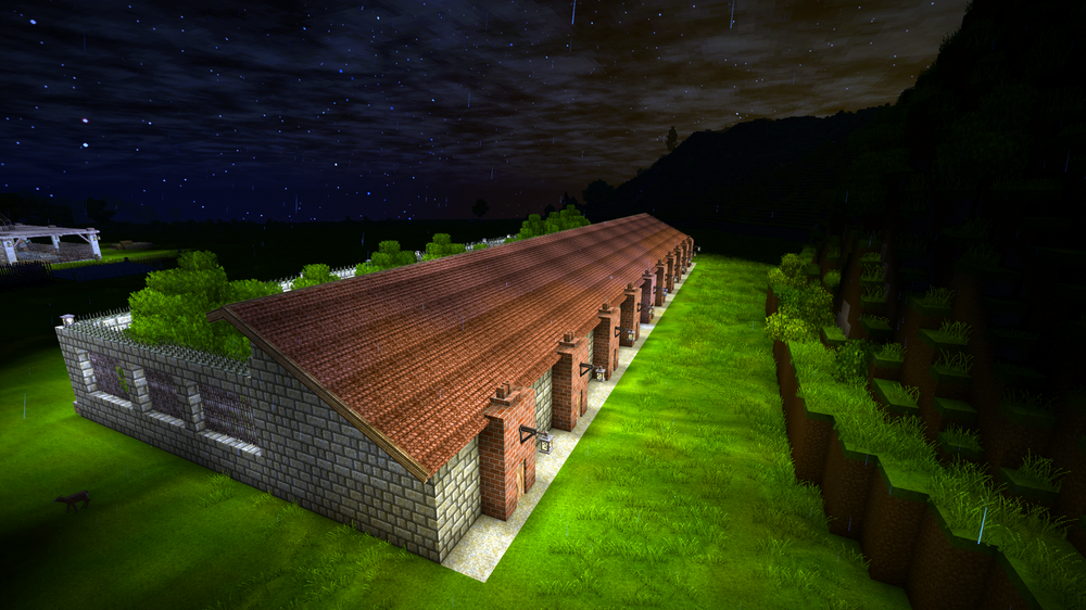 1.20.7 ( Survival single player ) A simple square shaped little temporary house with extended overhang flat roof and fencing all round. Not a lot of detail yet, but it's a work in progress. Tried to make the lightning rod look like it's supported with cables. Not sure if I've achieved that Decided I wanted some decent living conditions for my animals, so made them a cozy place to stay. Consists of 10 sections with open areas, feeding and drinking troughs, as well as access to a sheltered area for each section. The chimneys behind each section is for an enclosed brazier, providing heat to the sheltered area during Winters. Still a lot to do with plants, lighting, decorations and paths around the outside, but will need to go on another resource excursion before I can do that.