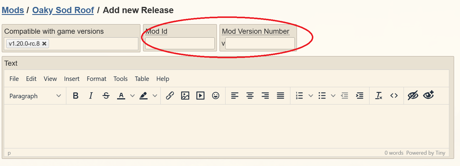 Although, in general I find the website does not play well with my browser. When I changed the modinfo.json I discovered that the zip I was uploading were empty and that the only way the website will properly upload a file is if you drag and drop it. Once I dragged and dropped the file the fields auto-filled.