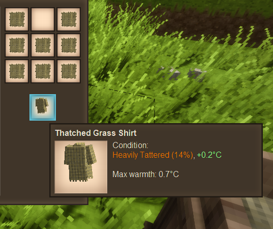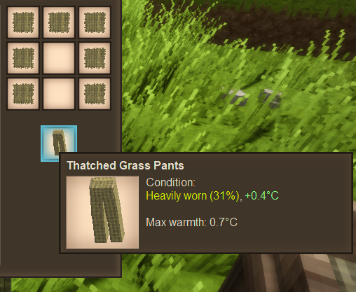 Hello! It's been a bit! I created this mod a while back in March of 2021, but have recently had some time over winter break from my studies and got back into it. After playing it a bit, I found that there were a few things I would want to have in the game, so I went about adding them myself! This mod is small right now, but I plan on working on it and additional mods that will cater to as many as possible. In this version of the mod, there are only a few additions/modifications to the game: Scythes now swipe twice as fast and cut more grass at once - I found it really quite aggravating to cut grass with a scythe and most of the time just ended up using a knife to cut it because it ended up being faster. I want going through the ages to save me time and effort, not just give me more tools that don't do much. Thatched Grass - Combining 9 Dry Grass in the crafting grid (one grass in each box) will give you a piece of Thatched Grass. Thatched Grass Clothing - Combining Thatched Grass in the crafting grid as you would for getting armor in MineCraft will give you either Thatched Grass Pants or a Thatched Grass Shirt. These clothes come with a low Max Warmth, but with the ability to remake them when the conditions get low. 64x Dry Grass can be added to a barrel in order to create one compost. This process takes 3 days, so it doesn't take forever to get a single piece of compost, nor does it take 64 wasted foodstuffs. Mod page link: https://mods.vintagestory.at/show/mod/4900 Dry Grass in Barrel: Thatched Grass Recipe: Thatched Grass Shirt Recipe: Thatched Grass Pants Recipe: Thatched Grass Shirt and Pants being worn: If you'd like to take a look at all of this in action (Note that this version puts the time to compost at 3 days instead of the 1 day seen in the video):