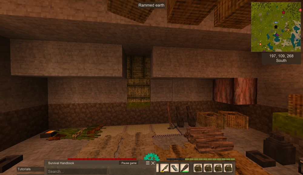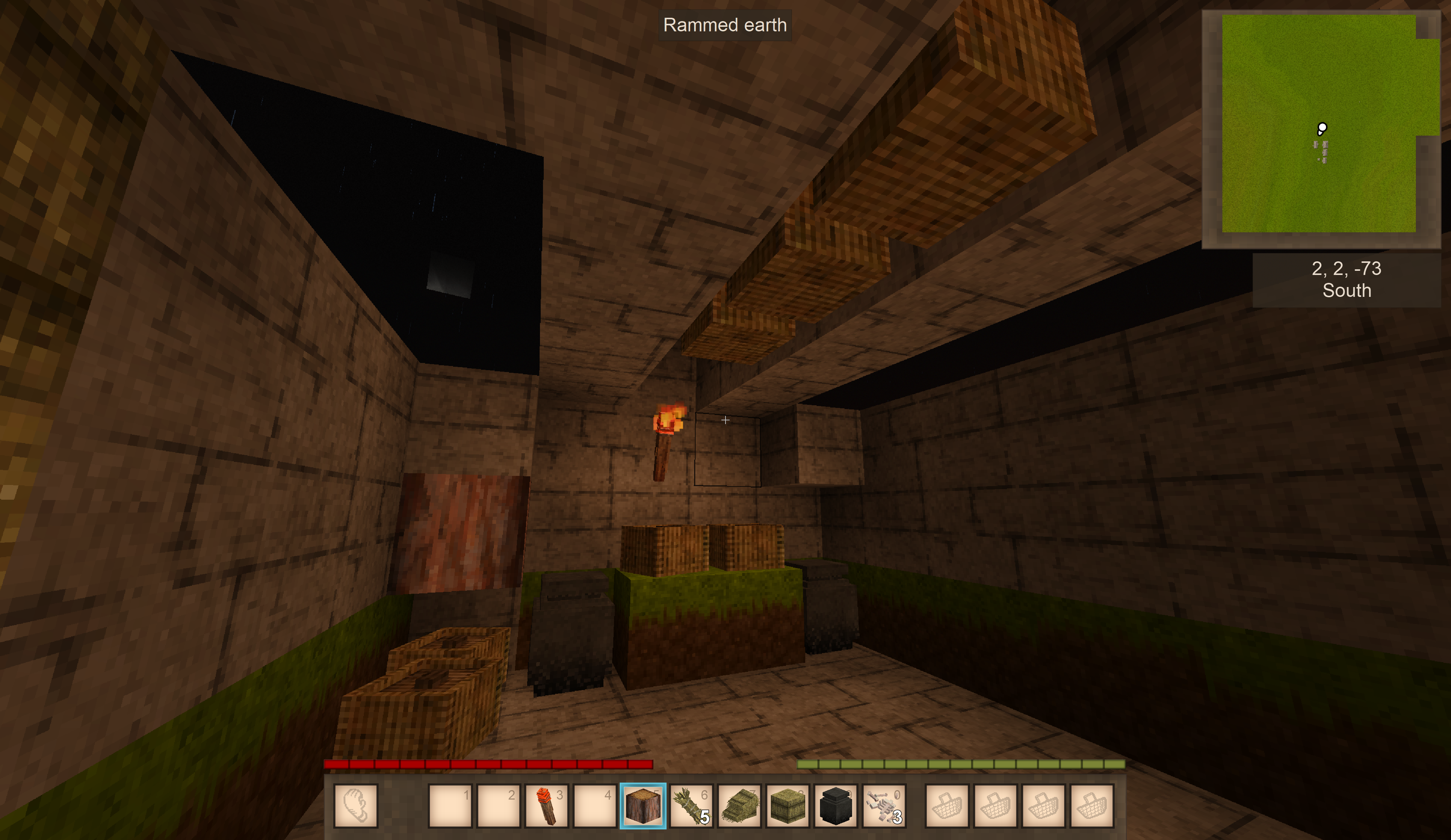 You know you need resources to create tools, but you don't know how long it takes to gather them. No one wants to start off mauled by a bear and finding yourself at sundown with little more than berries, a torch, and a hole in the ground. Don't know where to start? This guide provides a day-by-day workflow of resource gathering, tool making, building, and hunting for the first 5 days of your new world. Have fun! Tips to Know Before You Start: To find recipes for how to craft items and tools, press “H” and the Handbook will pull up. This also conveniently pauses the game! Shift is crouch; this lets you sneak closer to animals, or away from them. Ctrl is run! This is more hunger-inducing than walking, so do so sparingly. G is sit on ground; lets you work without expending as much hunger bar, though save this for when you are inside your house at night. C lets you check your in-game stats; your character’s stats and your world’s stats. M opens the world map. Enable "color-accurate" in the settings before starting your game to better locate clay and peat deposits. Don’t use a bed or sleep to pass the night. There’s so much you can do during that time and your character does not need sleep. Torches can be made to never go out, but this takes remembering to pick them up and place them back once a day (usually in the morning if you have torches both inside and outside your dwelling). They otherwise extinguish in 48 in-game hours. You can burn a lot of things to keep your cooking fire going; ferns, firewood, and peat are just some. First-time players and seasoned veterans both die a lot in this game, and that's ok. Don't let that discourage you. Turns out that you not staying dead is part of the lore, so treat it as a superpower that you can use to your advantage and that factors into the story, rather than as a meaningless videogame "life". This perspective helps a lot. If you need to, practice making the house from this guide first in a Creative world, or an Exploration world, where you have time to study its design and learn the game's mechanics and controls. This lets you feel more comfortable making a house once you are doing it for real and under pressure of impending nightfall, especially if it took longer for you to find clay than you expected. Finally, the in-game Handbook is your friend. Don't be afraid to pull it up, even if it's just to pause the game while you think. Suggested Goals for your first day (DAY 01): Knap 1 knife + 1 axe. (Knapping stone tools) Make 2 handbaskets + 1 chest. (10 + 10 + 24 = 44 cattails) Explore until you find a lake or two with cattails, but not necessarily aiming to find the super perfect location. Pick a spot that has flat, level ground, even if it isn’t right up next to the water. Make a camp with this singular chest (i.e. put it down and put a mark on your map): Put flint, berries, veggies, and fat inside. Stack any leftover items like unused cattails, flax fibers, small bones, seeds, sticks, and stones next to the chest (on the ground). You are staying here tonight, even if this isn’t your preferred location. Leave everything alone and head out to get: a few mushrooms (3-9), and berries (8-15) scavenge any dead birds (keep everything from these) sticks enough for 2 torches, 1 shovel, 1 backup knife (3 total) clay enough for 1 cooking pot, 1 bowl, 1 storage vessel (4 + 1 + 35 = 40 clay) enough grass to make 2 hay bales (8 + 8 = 16 grass) Return to your camp and deposit these items. Now begin to build your house. It is an 8x5 internal space, necessitating a 10x7 foundation (see pictures 1-3). First place down blocks 2x high in a 10x7 rectangle for your walls. Then add more to get up to x3 and x4 high on the narrow end walls. I used rammed earth (dirt --> packed dirt --> rammed earth), but you can use the others, too. The sun is probably setting by now. If you haven’t already, make a torch and fire-starter and light the torch. Set it on a wall. Now that you are enclosed, dig out the floor by one layer. This level is now the actual floor. Now you can make the roof. It will be an A-frame shape following the 2xwall-x2-x3-x4-x3-x2-2xwall pattern. Even if there is a gap between the wall and the roof, shivers can’t get inside (see photo 2; example of missing blocks in roof with moon in the sky--it's dark out!). Okay, now you are safe! The size of the room and the hay bales sealing the door makes the finished room get treated as a cellar. This design is efficient for balancing usable indoor space, cellar viability, safety (the gaps are shiver-proof), and low-resource load during construction. The design isn't as simple as a block house but it looks a lot nicer and it lets you conveniently store baskets under the peak of the roof, freeing up floor space. Later on you can make slanted thatch roofing (using thule or dried grass haybales) and place these over the earthen blocks. This is what you should do next: Re-organize your personal and chest inventories. Make a second torch and place this and your original one so that they are on both end walls of your house. This maximizes internal light and may help reduce drifter spawns outside, especially if you have a gap in the roof. Clayform the vessel, followed by the pot, followed by the bowl. This ensures you do not run out of clay for each item depending on how the voxels were applied. Cook any poultry you found. Save the veggies for later! If your hunger bar is near zero, eat until half-full and no more. If your hunger bar is about half-full (where it should be!), save the food until tomorrow. Going forward and when you have a better food supply, you should still only eat until your hunger bar is half full in order to ration your food. This means no food is wasted if you die, as you come back with only half a hunger bar. This also helps instill a mentality that positively affects how you hunt for meat, hides, fat, and bones, leading to more efficient and (often entertainingly) creative hunting t