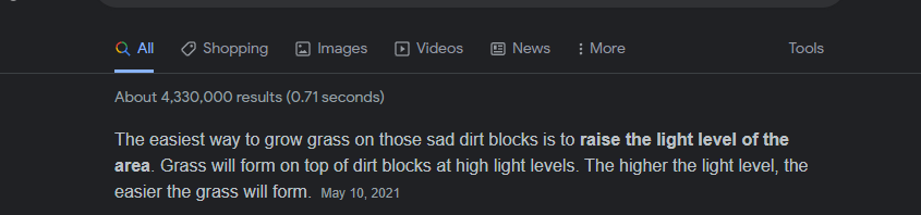 I feel like were bringing things in here to the suggestion that I did not suggestion, in order to make a point. 1. I did not say tree's should self propagate in my suggestion, I agree that would be a bad idea because forests would just spread uncontrolled. So the whole first part of your above post doesn't really apply at all to what I posted. 2. The world map already has grass, literally everywhere, when the world is generated so I am not getting your point here. I can't see why it'd be an issue to re-write the code to say "was grass cut on this block? Great, in a few days the grass will grow back if outside etc". So call it spread, or re-growing or whatever. 3. Grass should spread where ever a dirt block is...that's everywhere except deserts, polar areas etc. Your points do not seem grounded in reason at all if I'm being honest, what basis do you have to say grass growing back or spreading would cause any sort of hardware / lag issues? Minecraft has done this successfully for a long time and it literally runs at 100 fps on potatoes computers? You state games never do this, we really have one single game to compare this game to, and even then this is miles better in terms of performance and it's still early development. And finally, for the people who do not want grass to grow back, or spread, you can make it optional in the world gen customization.