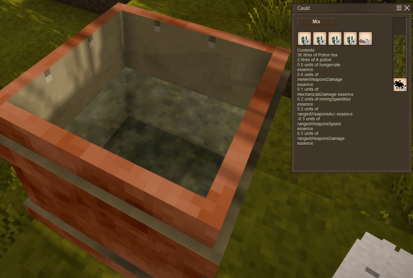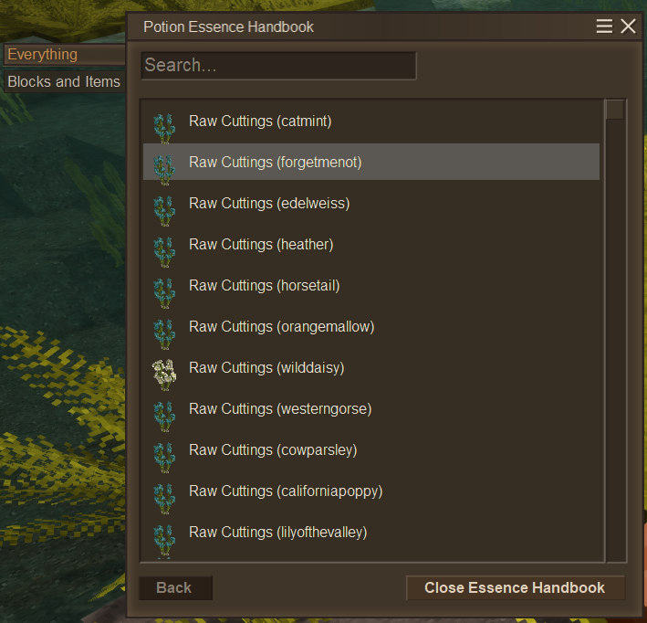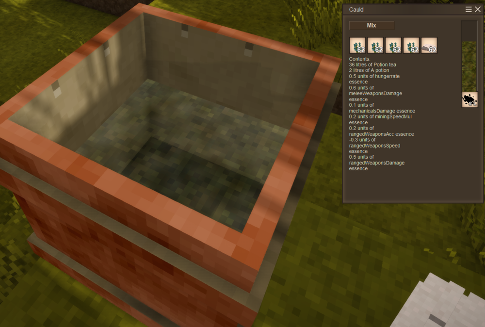 Hi everyone, I have been working on an update slowly for a while now to add a new way to make potions (This update is not ready yet). Currently to make a potion in this update I would place up to five items in the new alchemy cauldron with some potion tea or aqua vita in the liquid slot (like a barrel) and then click the mix button to create two litres of a potion that would give the effects that are listed. Anything can go into the alchemy cauldron as long as it has item attributes of potion essences which I have added with json patches into the game. I would like to add crops, various plants and other misc. items from the base game to the alchemy process rather than just flowers/herbs. The increase in ingredients used for potions lead me too making a new handbook specifically for potion ingredients. Currently I have a potion essence handbook that shows every item in the game that has a potion essence attribute. It works the same as the normal handbook, so you can hover over an item, open the potion essence handbook and it will head to that item's page which will tell you the ingredients essences. So at the moment the biggest task is to add potionessence attributes to everything that should be able to mix into a potion. Which is the reason I am making this post, its a big task to give so many items specific values. Here is the list of values that can be added to an ingredient: healingeffectivness, maxhealthExtraPoints, walkspeed, hungerrate, rangedWeaponsAcc, rangedWeaponsSpeed, rangedWeaponsDamage, meleeWeaponsDamage, mechanicalsDamage, animalLootDropRate, forageDropRate, wildCropDropRate, vesselContentsDropRate, oreDropRate, rustyGearDropRate, miningSpeedMul, animalSeekingRange, wholeVesselLootChance, animalHarvestingTime, glow (currently if it has any amount of this it makes you glow at full strength I may make this adjustable) recall (if it has any amount of this it teleports you back home) and duration (This is just how many seconds the potion lasts). All values in the list will add a percentage to your stats except for glow, recall and duration. For example if you drank a potion that has 0.1 units of oreDropRate and -0.1 units of miningSpeedMul, you would gain +10% more ore but would be -10% slower at mining. What I was currently thinking for item essences was herbs/flowers would have higher values giving great buffs but also giving a debuff for example something like 50% rangedWeaponsDamage, 30% rangedWeaponsSpeed but -30% rangedWeaponsAcc. I was thinking for items such as crops that they would provide pure benefits and very little/no negative effects. Maybe something like a carrot would provide a 10% increase in rangedWeaponsAcc. So if anyone has any ideas on what values should go onto what item let me know. Bonus points on anyone who tell me real life benefits or folk lore aspects of certain crops, flowers or items (such as, I have heard that carrots help your eyes so I will probably make carrots give a rangedWeaponsAcc buff since I would say that would be to do with eyesight). Please let me know of any suggestions, feedback, clarifications or ideas with the new direction this mod is taking. All feedback is welcome even if its something as little as what I should rename something too.