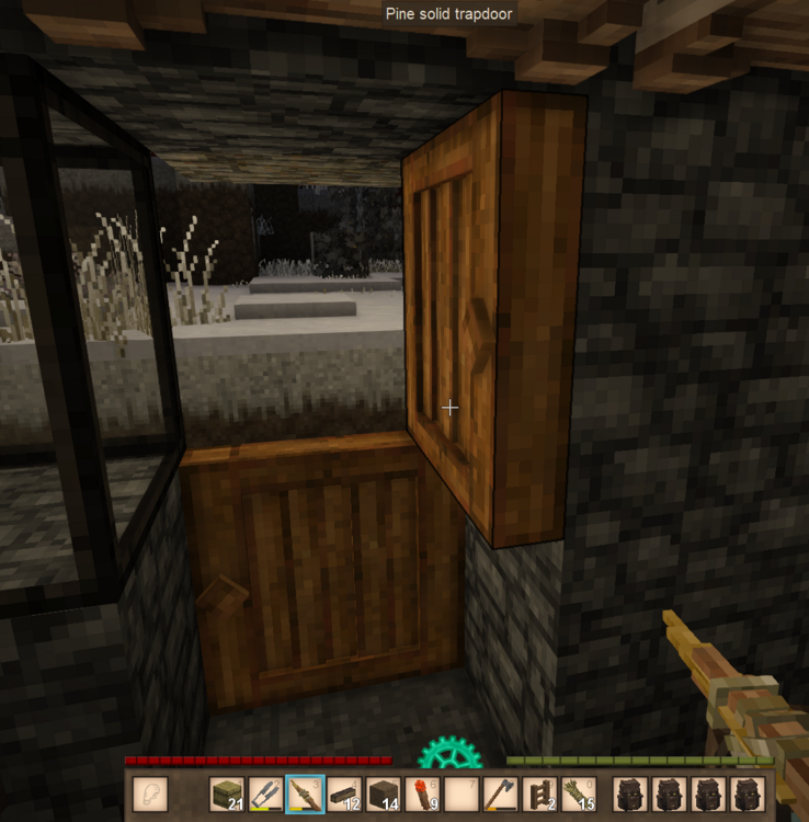 re: farming temporal gears. Lots of people like to go through pain and suffering to get blue gears, but you can farm them right out of your house and it's not even difficult. Here, look at this: This is a simple Dutch door-- top and bottom halves that can be opened or closed separately. In game terms, it's made from two "solid trapdoors," in this case pine. You can build this as soon as you've got a saw. Once you've got this on your house, wait for dark, get a spear-- bronze is great, but stone is okay if you make several of them ahead of time-- open the top half of the door as shown, and wait for a drifter to walk by. Then.. and I know, this part is complicated.. you stab it. Once all the drifters in front of your door are killed, nip out and loot. I get about one gear per night with this setup, plus string. One note, you can see I'm standing back a little. This is why I use spears for this, they have REACH. You can hurt them, but they can't do anything but throw rocks. If your health does drop below half just close the top part of the door. -