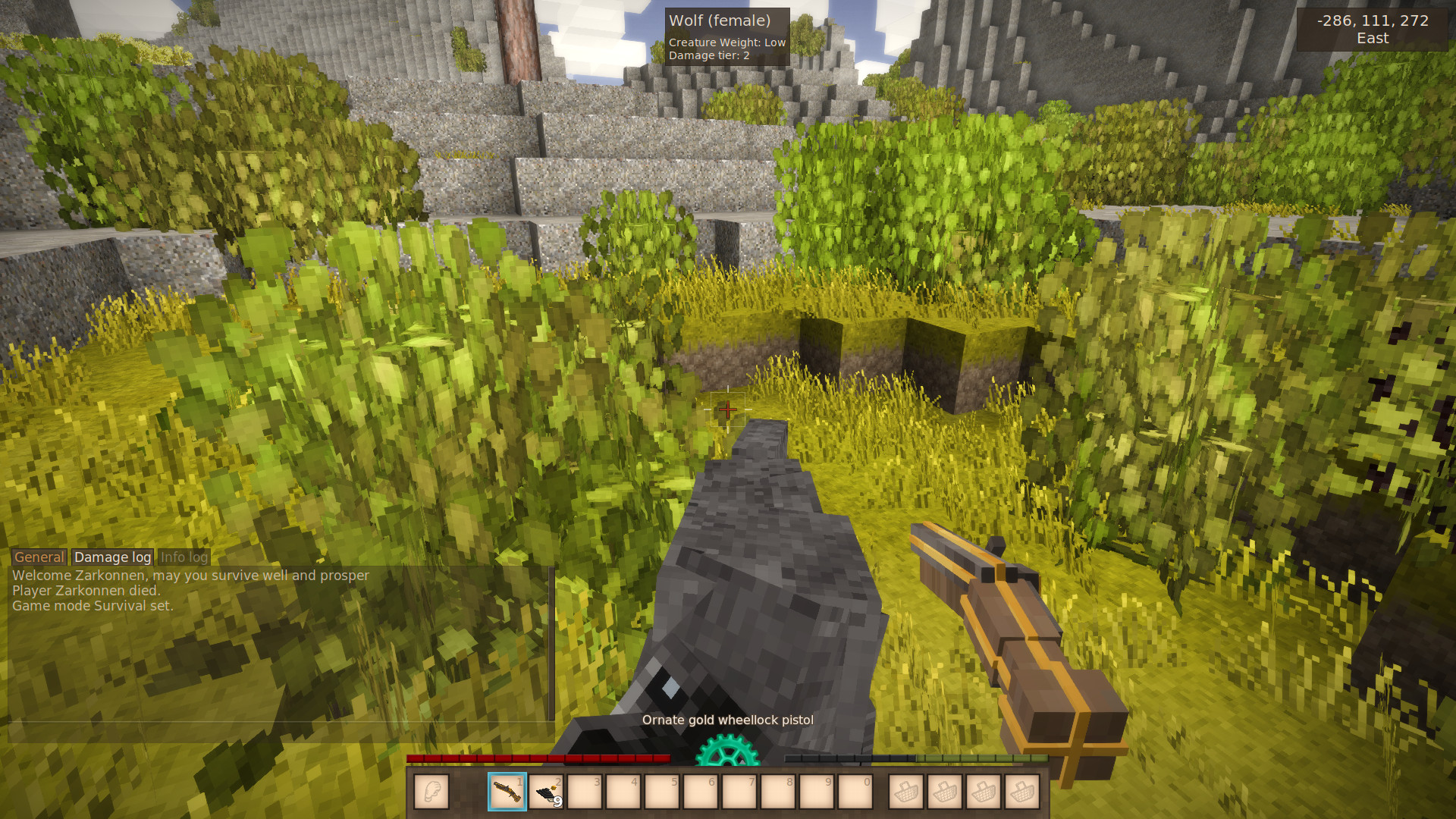 Another update, this one adding wheellock pistols. Unlike crossbows, hand cannons, and arquebuses, these things stay loaded even if you stop holding them. Their main disadvantage is that they are less powerful than an arquebus and have little durability. Here's an ornate gold pistol used as a last-ditch defense against a wolf. -