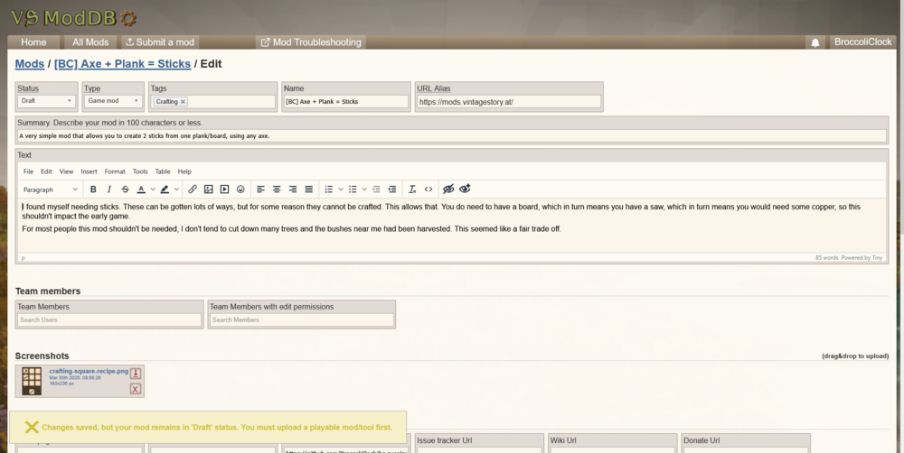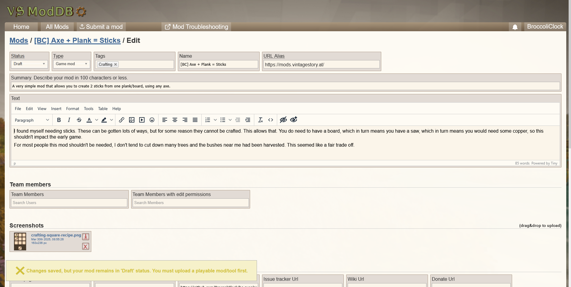 First off, I just want to be clear. I am glad there is modding in the game, and I like that the mod database is on the official site (I find 3rd party sites can become unreliable). I also think the way the mods can be created for this game to be really accessible. It almost makes me want to mod the game because it's so easy (at least from what I can see). However... however... and I am sure that there is a trick to it, but the whole process didn't come across as intuitive. I'm not new to dev, coding or mod building, and I have used numerous mod upload interfaces before. There seemed no place to upload the actual files, and asking it to publish showed possibly one of the worst warning messages possible, a yellow text on white background that disappears after a second or two. I literally had to repeat the process several times just to read what it said, example in spoiler below.. It kept saying you must upload a playable mod/tool first, yet there is no place to upload those files. It was only by accident that I found that if I navigated away from the edit mod page and go to the actual mod page, and if I was logged in, I then found the file upload option. So to clarify, I can do everything except upload the actual file from: https://mods.vintagestory.at/edit/mod but then I had to literally navigate away from that page and go to the "published" mod page, https://mods.vintagestory.at/show/mod/21934, only to find a Files tab (unselected) where I could upload the files, example in spoiler.. Perhaps I've been an idiot, perhaps I didn't RTFM properly, perhaps I missed some text somewhere explaining this, but for me this process was confusing and awkward and almost had me giving up. If this is the intended process of uploading mods, then please provide clearer instructions and for crying out loud no more yellow on white temporary error messages.