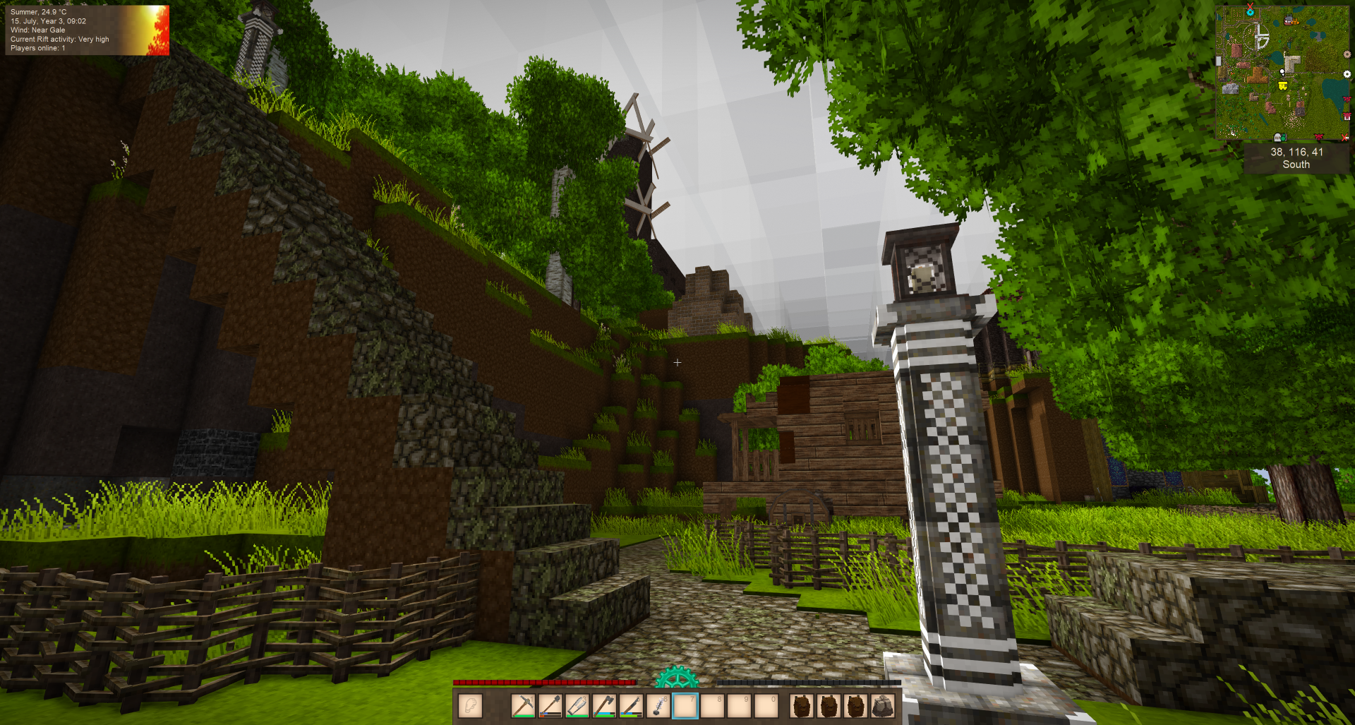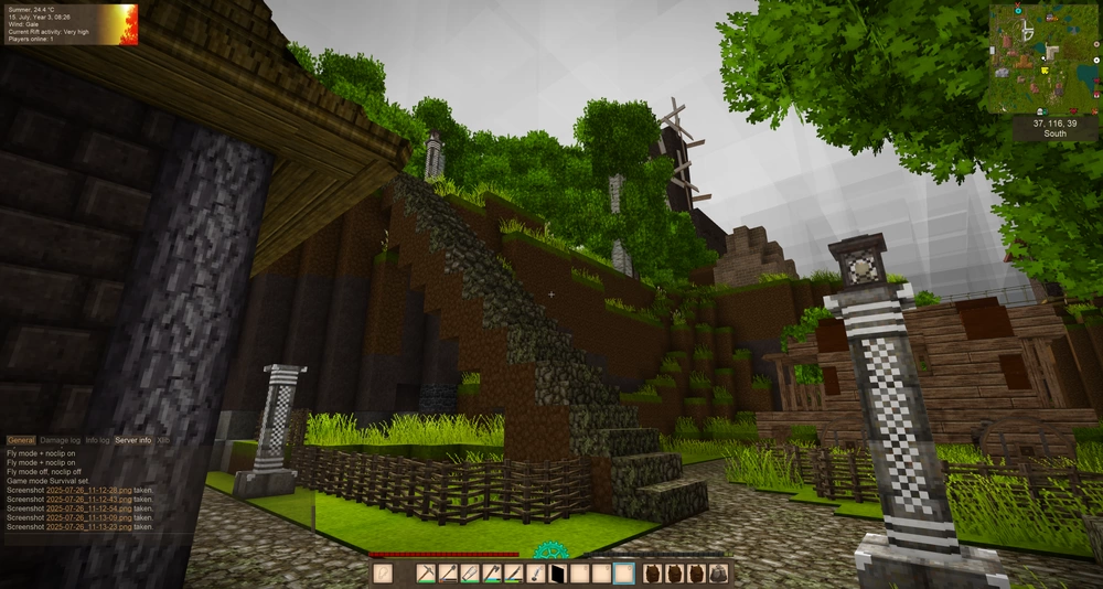 I love the idea of developing a world and building a town, or towns, etc. It's definitely not Vanilla. Double backpack space, 5x stack size, bunch of mods I listed in the comment below. I have a discord I started for this so we can continue from the world that was abandoned. It deserves better!