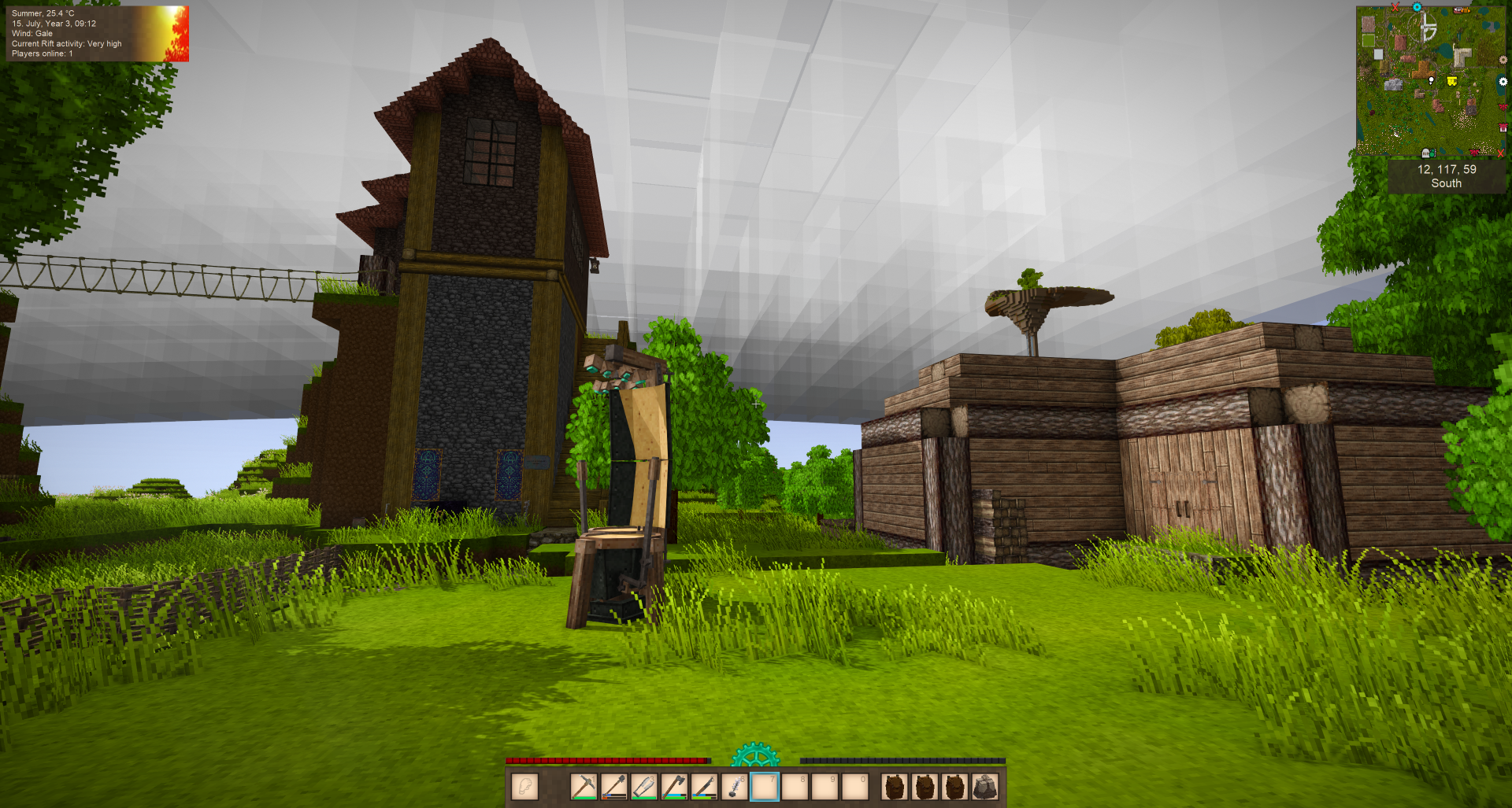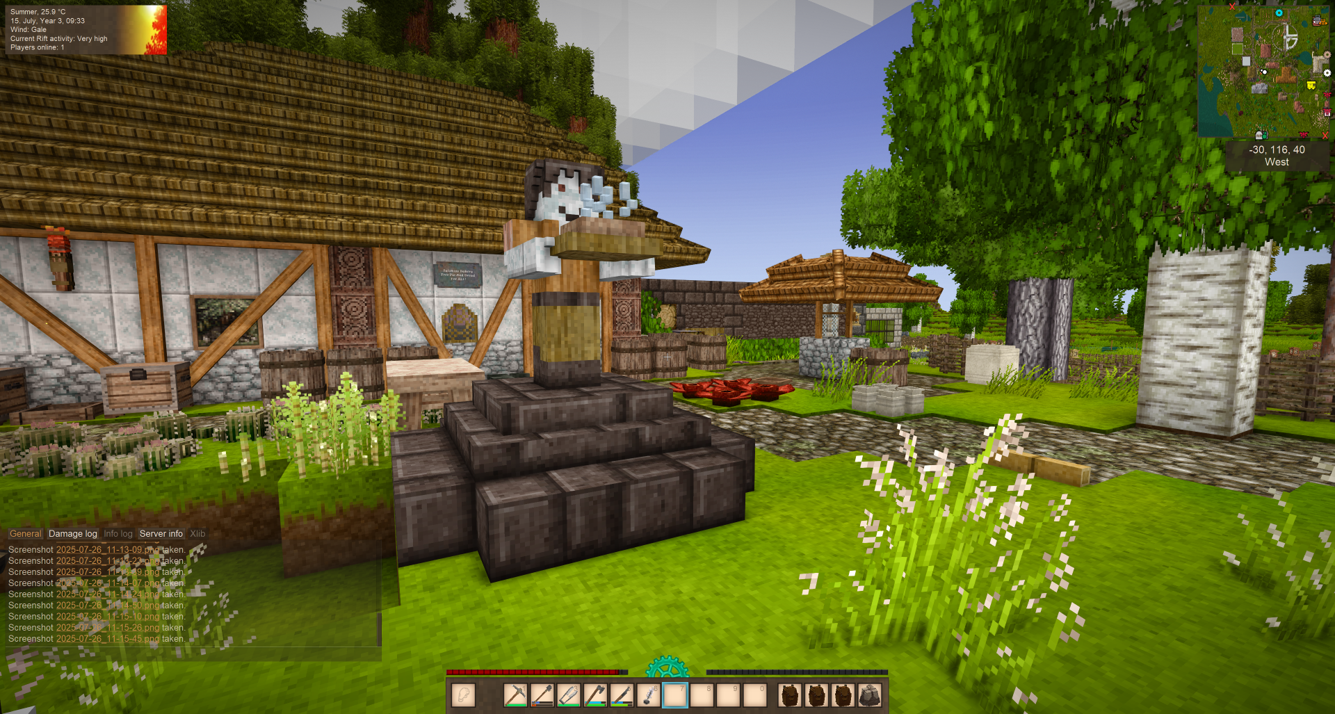 I attached screenshots of the current state of town. The single helve hammer / single quern / single pulverizer shop in town (there are others around, but the public one..) ... I don't think anyone is working on that anymore. I'm happy to go in and dramatically expand it but I may not be the best for the job.