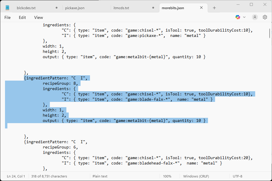 I mean, really, I'd like to be able to group all of the similar item types into an array to simplify the amount of code it seems to take to perform a similar operation on many different, but similar items.. It seems like there is a lot of redundancy in the JSON scripts, but what do I really know about JSON scripting? I'm sure there is a logical reason for the way everything is structured, but I've still a lot to learn how all of these gears here operate and fit together. I missed being able to replace "name" with the "allowedVariants", which should be fairly useful when I give it some time to culture.