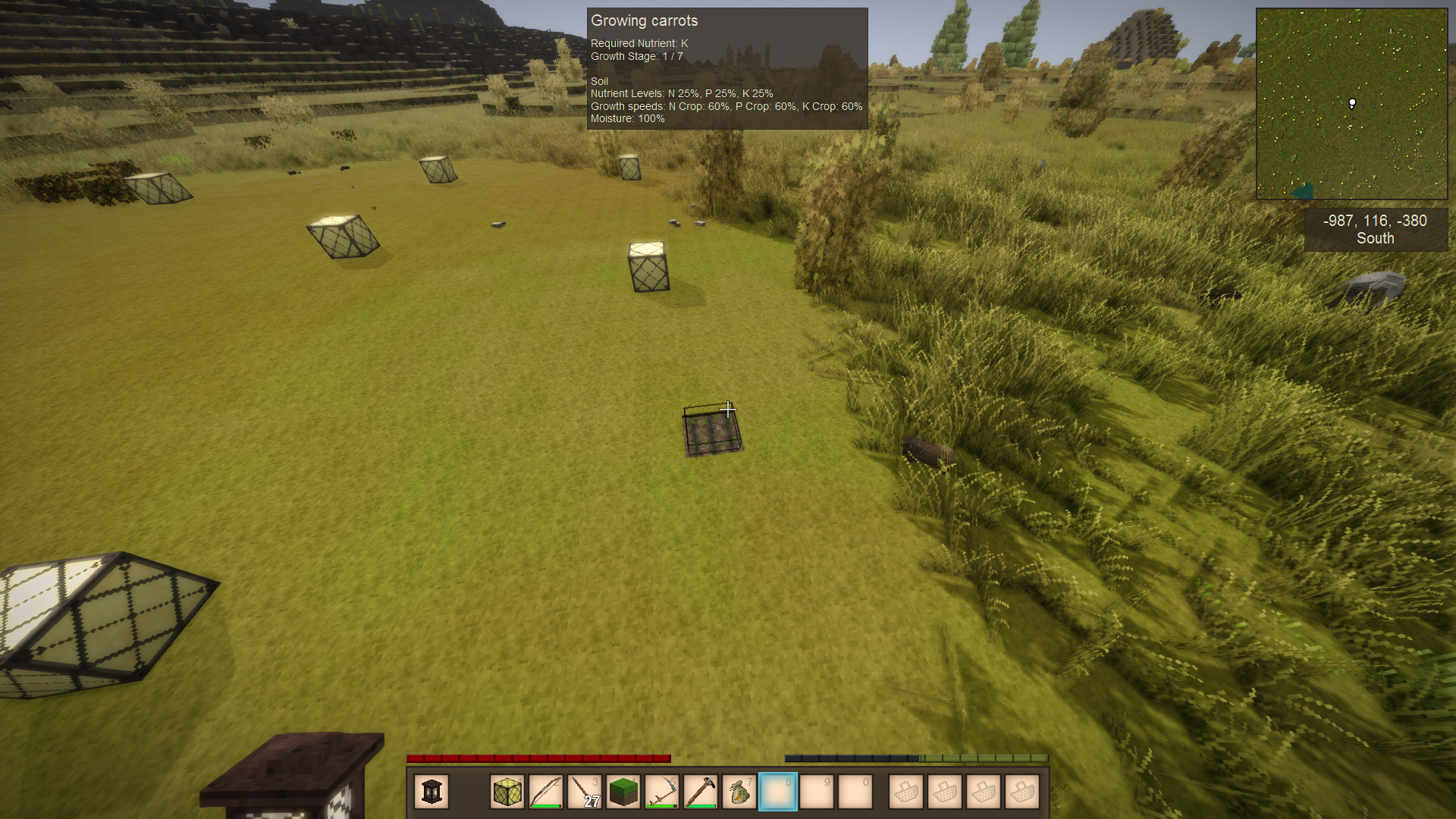Farming should be hard enough that people feel the need to either build a farm or move around as a nomad. Right now farming is in a good place as the amount of food it provides for a given input is proportional to the amount of work put in to the farm (fences, irrigation, roads, glasshouses, etc.) Living as a nomad is fine for exploring early on. Progression is good too, since you have to play as a hunter gatherer until you get enough seeds to have a farm that can feed you. Once you do start, there are crops (onions mostly, but also rice and pumpkins) that do not need a fence to protect against rabbits so you can live off those while you are getting a fenced field up and running. Later on you can make glass houses and can irrigate your fields so you have a longer growing period and no longer need to water crops anymore. As for the daily work associated with it you still have watering, fertilizing, and you have to monitor the temperature to see if further planting is possible.