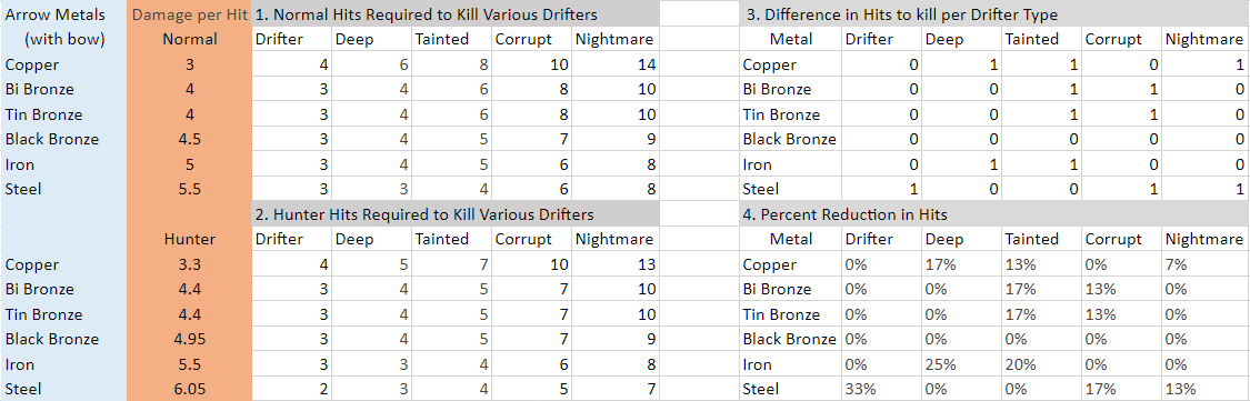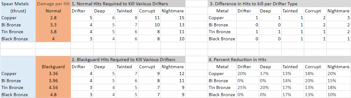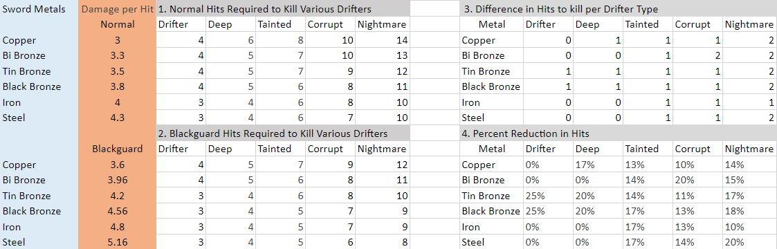 People just do not grasp the advantage of the Blackguard. I like the black guard the most because it is the most suited for exploring the most challenging environments (for me anyway) of the underground and dense forests and is also the most material efficient of all the classes while doing it. Metal is probably the most valuable, but costly, material to produce in the game and you never stop needing it. Metal needs ore to be mined from usually dangerous areas, the most infrastructure built (basic workshop, mines, and a lot more for iron and steel), charcoal or coal in large quantities, and requires active player participation in most of its processes. The black guard has the best traits with regard to the metal industry as black guards can mine faster, most of their weapons and armor last longer, and they are the most suited for the underground where most ores/minerals are mined. Mining faster is a nice bonus to minimize the time spent underground but a bigger advantage a Blackguard has is how efficient he is with metal weapons and armor. Black guards add 10% armor hp and since you can use nearly destroyed chainmail in the creation of full hp plate or scale mail, you get effectively 60 to 420 extra hp depending on the armors used/made (chain mail into scale or plate works best), which works out to quite a few more attacks blocked before breaking, especially with high end armors like plate mail which can knock the incoming damage down a lot. As far as I am aware, tool durability is only decremented by the number of actions done or blocks/items affected (an exception is the heavy hit function in forging), so each attack with a sword/spear decrements its health by one. Since the Blackguard has a 20% damage buff he can reach some break points for some weapons and save metal with fewer hits. ***I made the following assumptions: Damage values are not rounded up nor is there damage variance or "crits", and drifters have no damage reduction nor armor (that I could find). If not in the in-game handbook, I used what the wiki said. I also have not tested these numbers as I am lazy.*** I did not include Gold, Silver, or meteoric iron due to their rarity and unlikeliness to be used as a weapon, but they have the same damage values as Bismuth Bronze and Steel respectively. You can find the numbers in the in-game handbook. You can determine three things when looking at these graphs; that Blackguards can kill the weaker drifters faster than a commoner with tin bronze weapons, he can kill the three most dangerous drifters faster than a commoner with any melee weapon, and he since he kills with fewer hits the blackguard's weapons (the ones with reductions) will last longer in his hands than in a Commoner's. Looking at how long the melee weapons last for a blackguard it gets real good. Against plain drifters, Tin Bronze spears and Tin/Black Bronze swords will last 33.33% longer for a black guard than a commoner (Equivalent Durability Modifier = 1 / (1 - reduction %)). Against deep drifters (another common drifter), the same weapons will last 25% longer for a black guard. Against the more rare and dangerous Drifters (Tainted, Corrupt, Nightmare) Black Bronze, Iron, and Steel weapons will last around 16.7% to 25% longer. It is unfortunate though that steel and iron weapons do not get an durability advantage against the most common drifters. The Hunter does not reach many breakpoints with spears with only a 10% boost. With most metal spears, he is no better at killing drifters than a commoner, but this is not to say that the hunter is bad, just overrated. Since thrown spears do roughly 1.5 times as much damage as swords you might think that they would have an advantage in DPS and damage per metal invested against swords, but this is not true for common classes or Hunter thrown spears vs Blackguard swords. They do cost 1 hp per throw and do roughly twice the damage of a sword blow, but swords have roughly 2.25 times the durability of spears, so swords have a higher damage per metal investment ratio. For DPS, I found that I could swing a sword two times faster than accurately throw a spear at a nearby drifter, as I had to aim to get the throwing window small enough to ensure an accurate shot (though someone more experienced than me may be able to do better) which basically means spears did twice the damage but took twice as long per attack compared to swords, for roughly equal DPS (experience with each weapon will probably determine which is best for you). Hunter does kill a bit faster with arrows, but he gets only a minimal benefit for durability thanks to how bows and arrows break [edit: still true]. While the percent reductions are not good for most of the drifters you will be facing, you have to remember that it is only the bow that loses durability, meaning only sticks and string are used (and easily replaced). Arrows can usually be recovered with good rates [edit: This is only true for missed shots which seem to never break. About a third of shots that hit a creature tend to break, which really cuts down their efficiency for a Hunter to around 8.5+1 drifters per ingot invested. A sword can easily reach over a 100 drifters per ingot invested for a Commoner] and they are also manufactured at 9 arrow heads per ingot and thus are a very metal efficient option [edit: They are the worst option I am aware of. Bows and arrows are "the best" only if number of slots and sustainability (no picking up ammo/spears) are a priority. They really need some love to be worthwhile.] (if rather bottle necked by low feather availability). Bows and arrows do have a bit less DPS than swords (less attack speed) and spears (less damage per shot) for any class though this is usually not an issue for ranged combat. The underground environment typically has the following characteristics: Low light, which means your sight is going to be limited by how far your light projects. Assuming the tunnel or cave you are in is greater than you